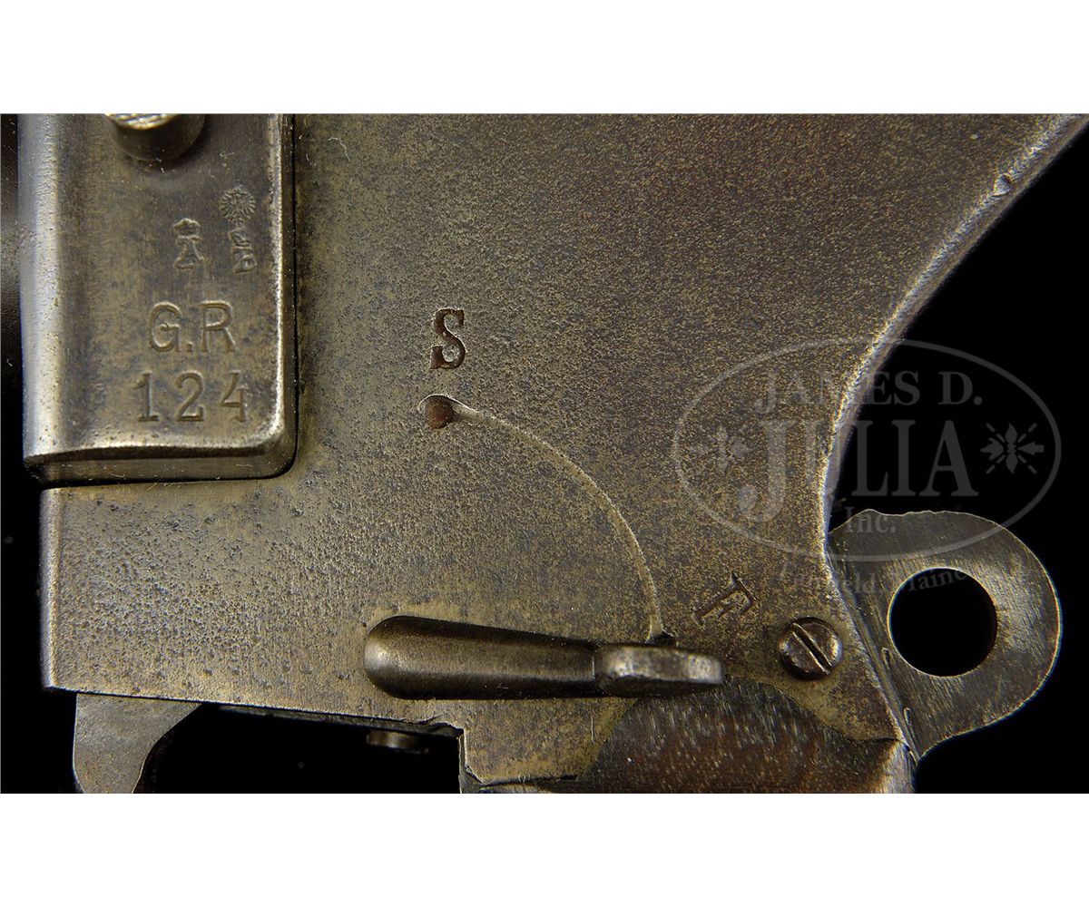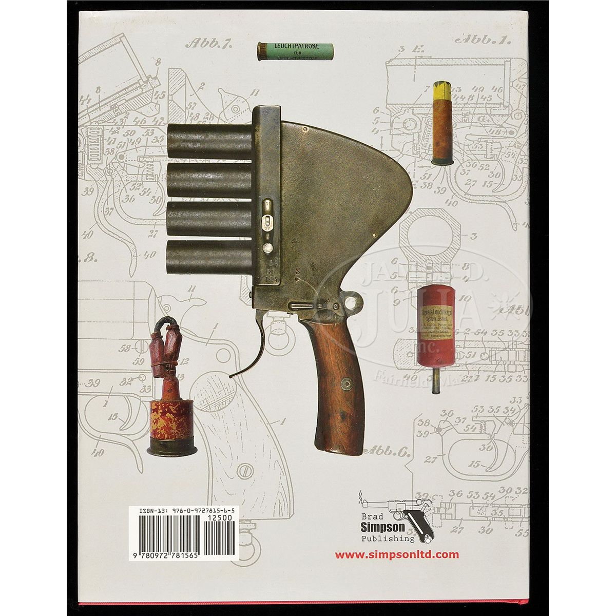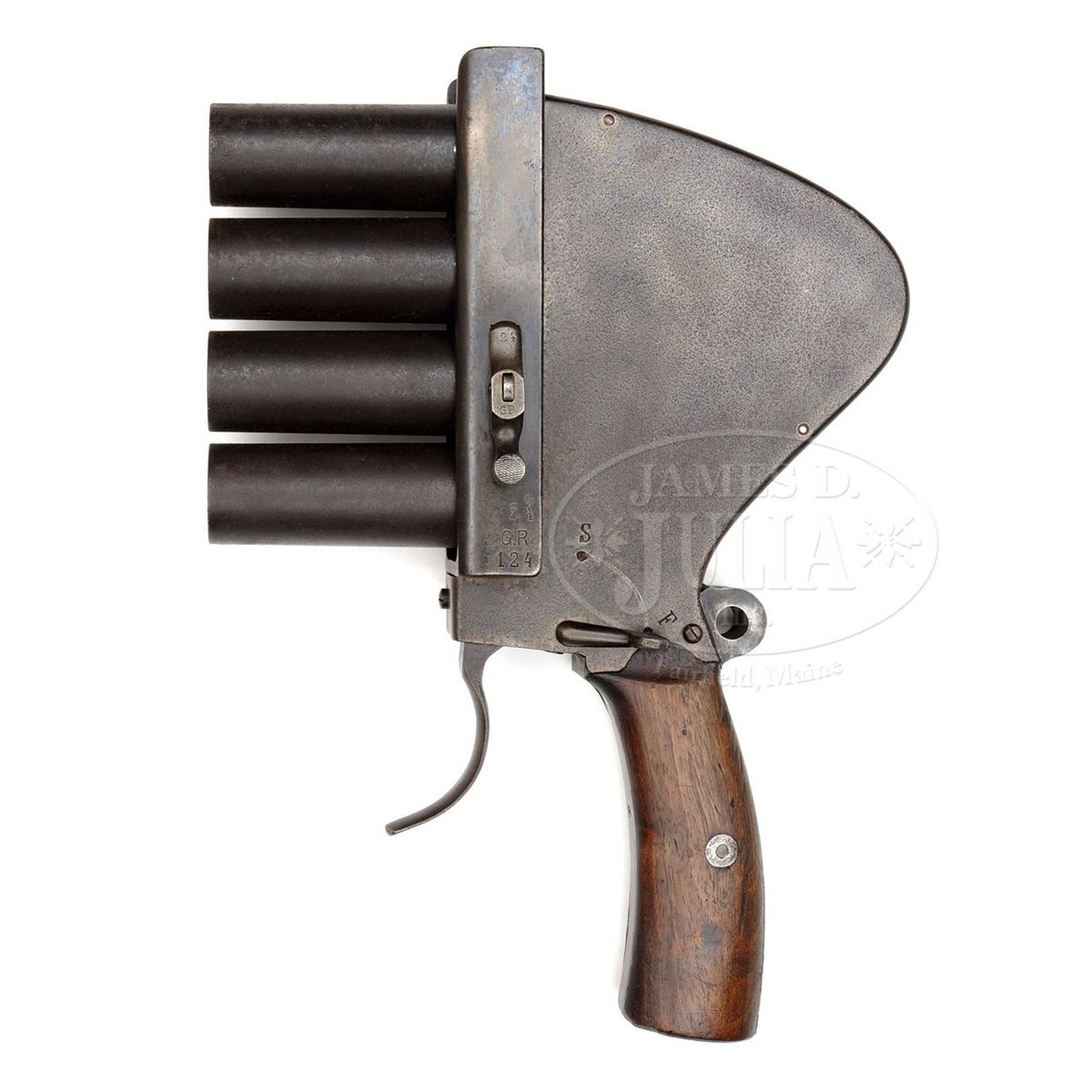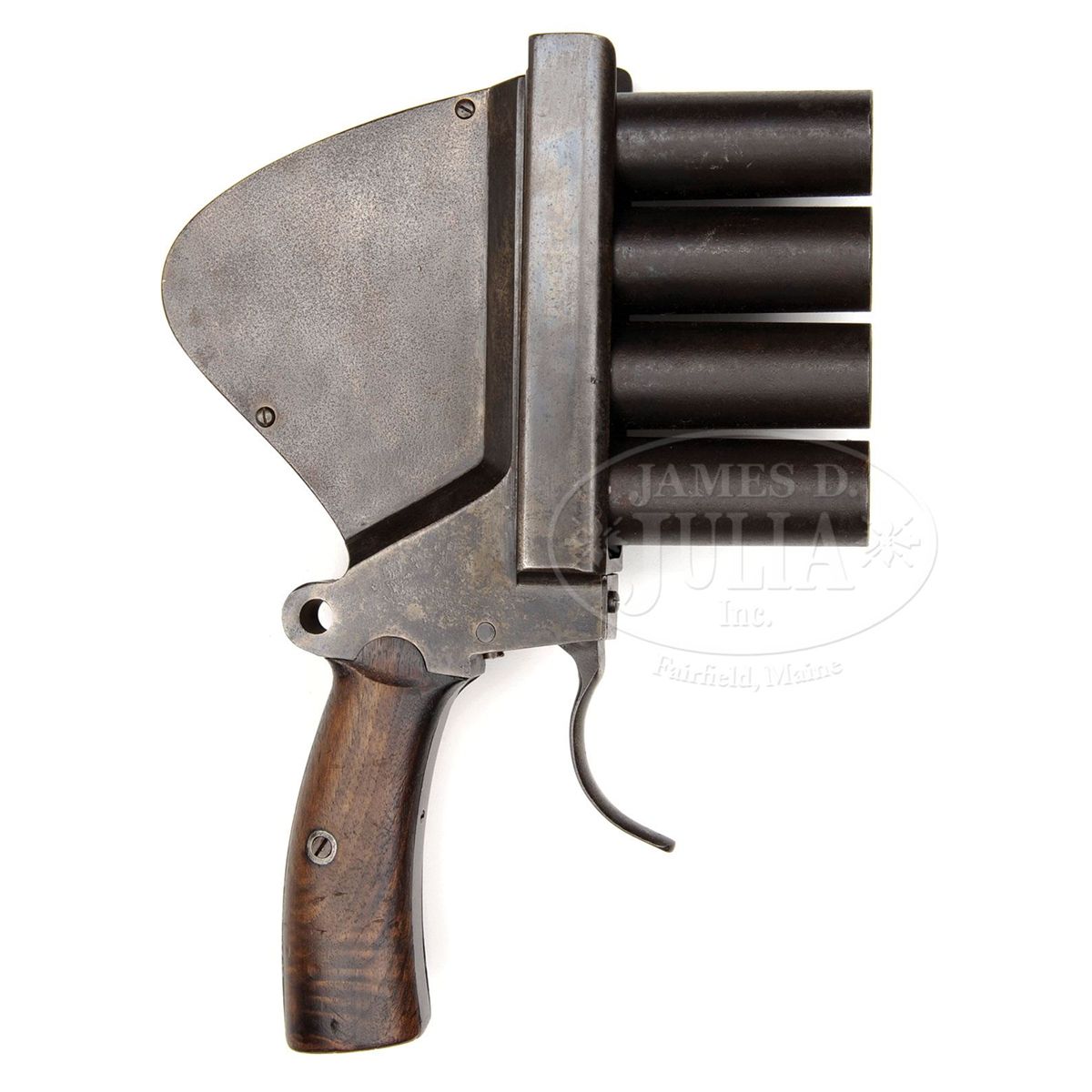 SN 124. 27mm 3-1/2" bbls that are aligned vertically and Crown/B proofed. Receiver is "G.R. / 124" (Gebruder Rempt manufactured, SN 124) marked and is Crown/B and Crown/A proofed. Bbl release lever on receiver is "G.R." marked and has the matching number 24. Large safety lever on frame with safe and fire positions marked "S" and "F". Smooth walnut grips. Designed to illuminate airfields at night for long periods of time without reloading. According to a flare gun registry, only 22 examples of four bbl flare guns are known. Because of its unique and interesting appearance, this gun was chosen as the centerpiece for the back of the dust jacket of German Flare Pistols and Signal Ammunition by Dr. Lorenz Scheit. PROVENANCE: Collection of Dr. Geoffrey Sturgess. CONDITION: Fine, covered in light pitting with blue that has been restored to 80%. Bores have light pitting. Grips are very good with moderate wear and minor dings and scuffs. 4-52672 BWS131