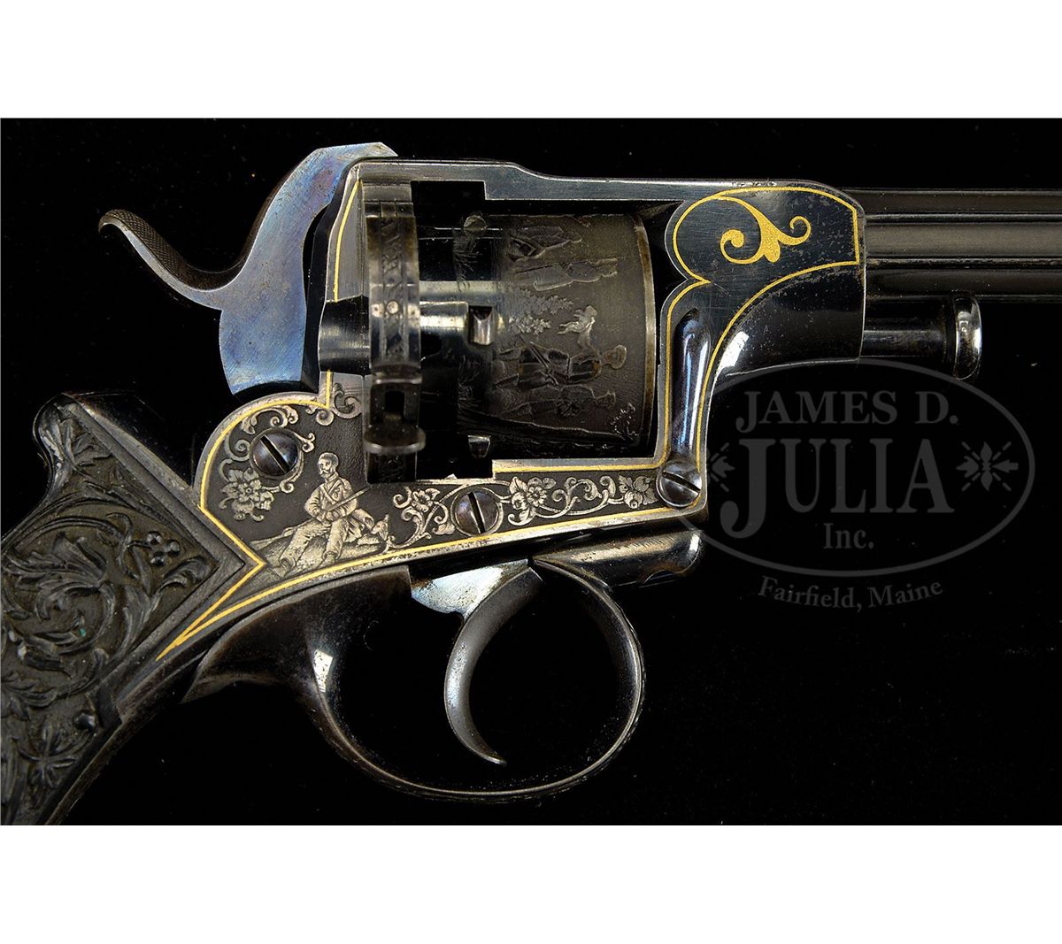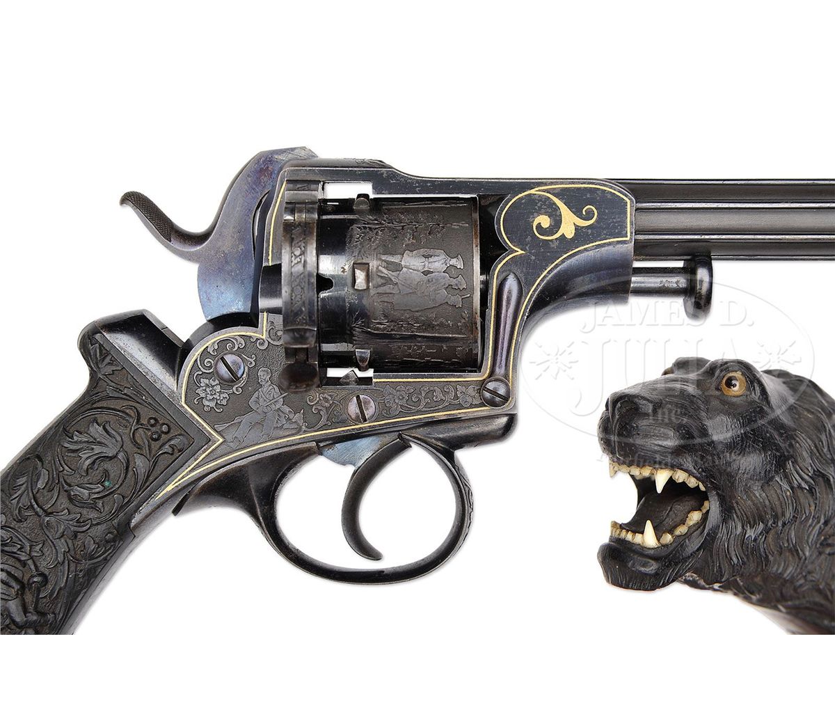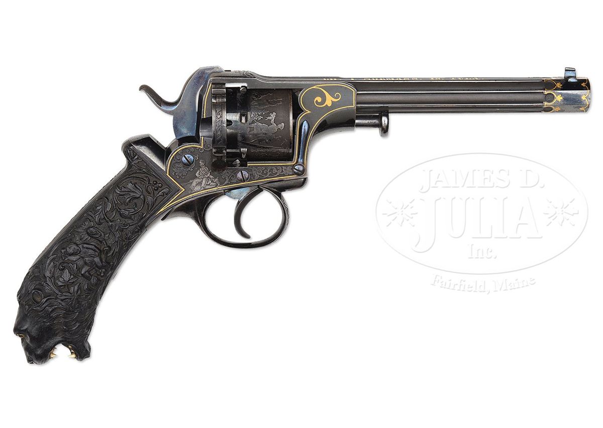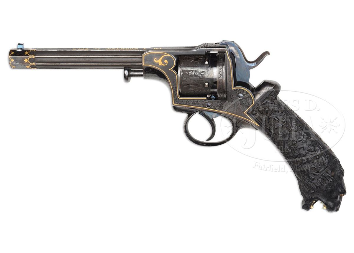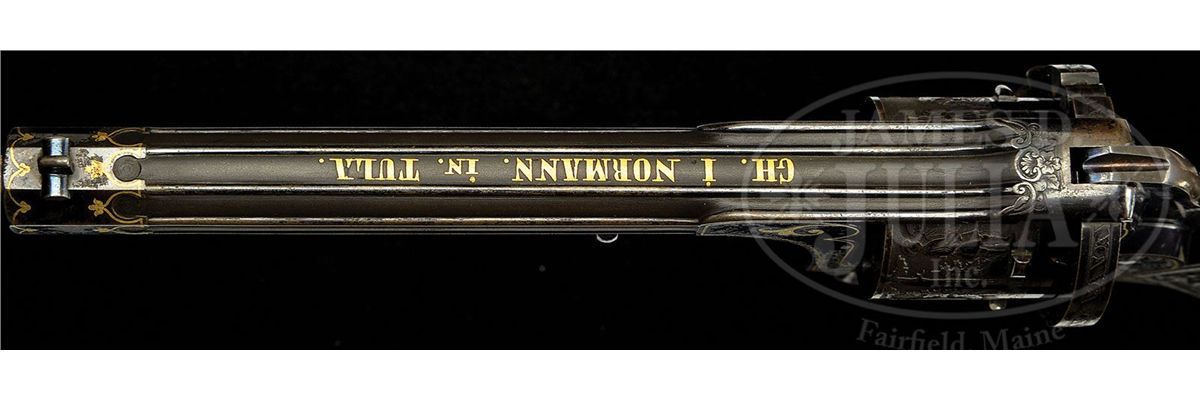 NSN. Cal. approximately 7.5mm pinfire. 4-7/8" bbl, 10.4" overall. Bbl inlaid in raised gold "GH. I NORMANN IN TULA". Bbl is fluted and oct at muzzle. This unique revolver has the finest etching portraying Russian officers hunting on the cylinder of a quality virtually unknown on European pinfire revolvers. One can see the actual cut of the uniform coats and hats and the eyes on the small game they are hunting. The leaves on the trees are accurately delineated as well. The frame is etched with a Russian hunter holding a long gun and the other side a recumbent Russian with what appears to be a European man with long hair picking up his blanket. The etching on frame is accented in gold. Oct section of the bbl is inlaid in gold. Trigger guard is etched, as is the recoil shield on the rim. Perhaps the most Russian and the most wonderful feature of this gun is the elaborately carved ebony grip. On the right side amidst florals in raised relief is a raised relief boy with a fig leaf covering his private parts beating a drum. The other side depicts a boy with a pair of cymbals. Butt ends in an incredibly realistic lion head with teeth so accurately rendered one can see the facets of the molars. The eyes are pale amber inlaid with dark amber. Altogether a piece fit for the Hermitage Museum. NOTES: The etching on this revolver closely resembles two revolvers in the collection of Robert M. Lee, one of which was presented to the German Kaiser. Russian revolvers of this quality are seldom, if ever, encountered. Fewer than 5 have surfaced in the past two decades. PROVENANCE: Capt. Clair F. Ogden, Laurel, MD, 1951 by descent to the present owner. See letter from Theodore Dexter to Capt. Ogden dated May 20, 1951. CONDITION: Metal surfaces retain much of their original bright bluing. Hammer retains almost all of its original bluing. Gold is in pristine condition with the exception of a minuscule amount missing from the "L" and "A" in Tula. The ebony grip is pristine except for a very small chip where the top of the grip meets the frame. 4-48396 MZ18