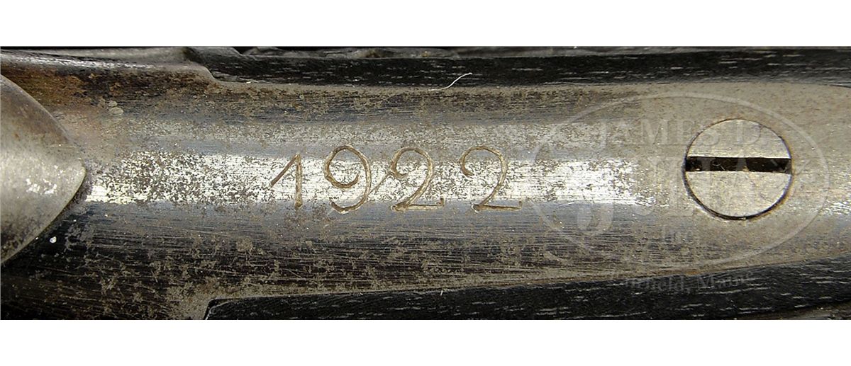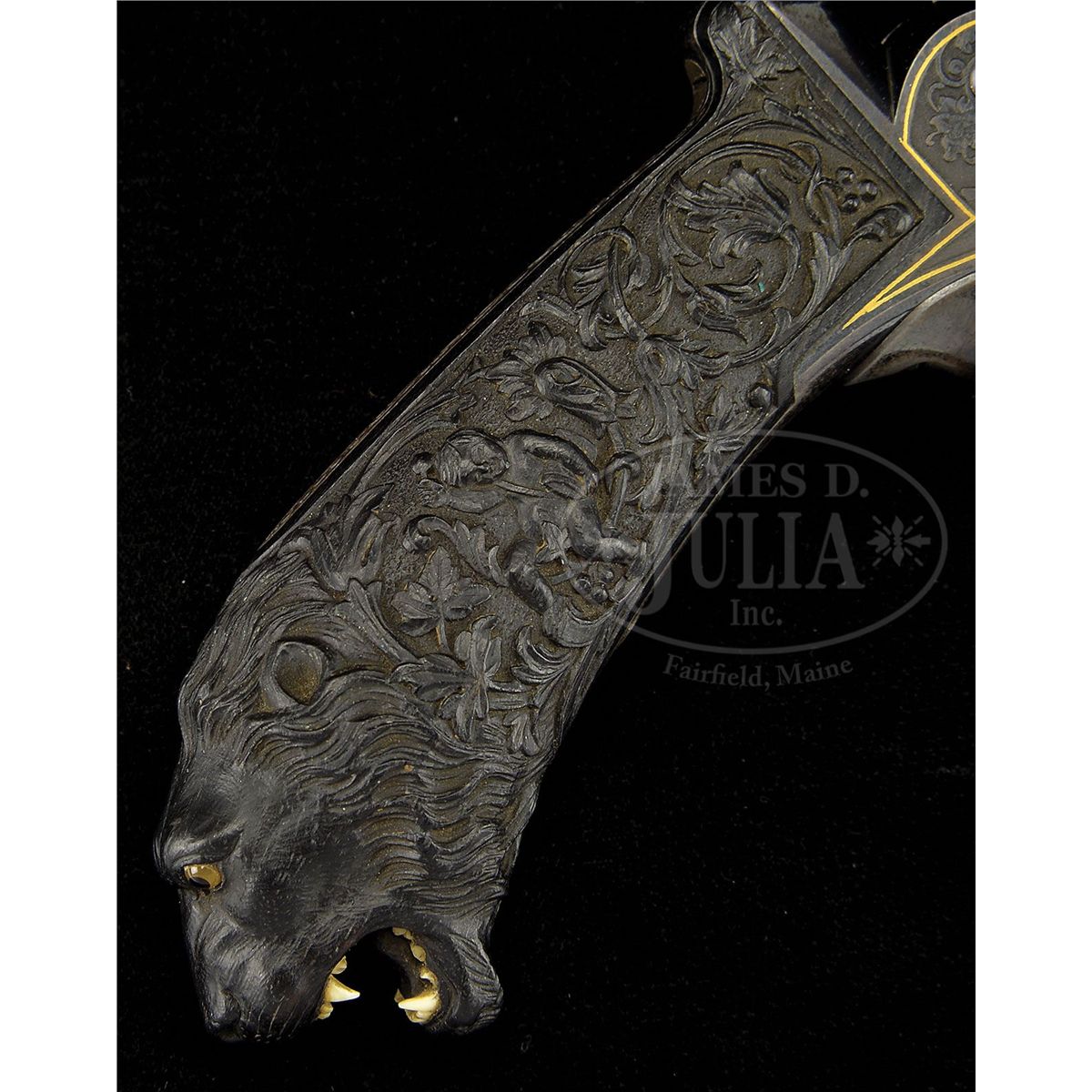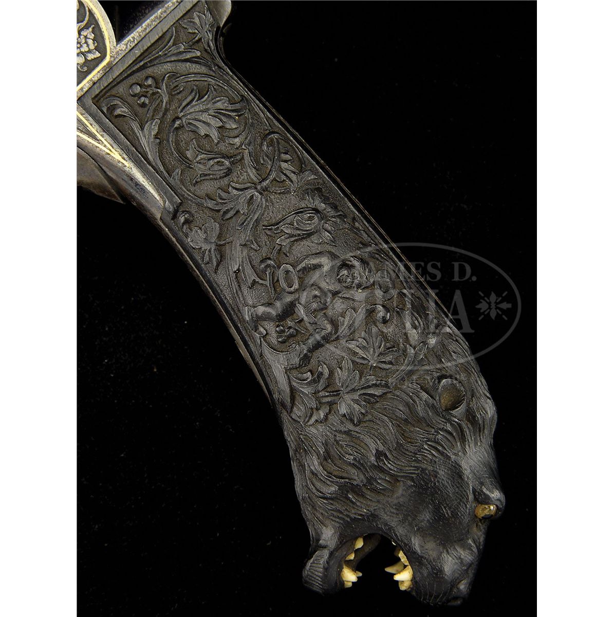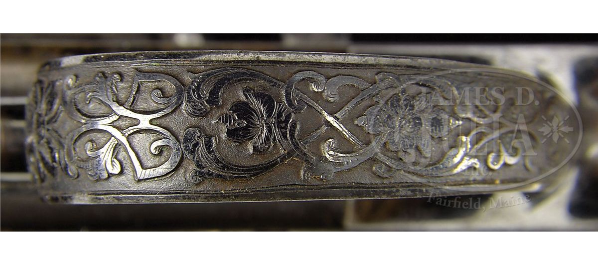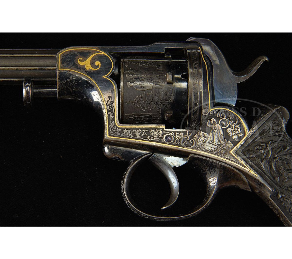 NSN. Cal. approximately 7.5mm pinfire. 4-7/8" bbl, 10.4" overall. Bbl inlaid in raised gold "GH. I NORMANN IN TULA". Bbl is fluted and oct at muzzle. This unique revolver has the finest etching portraying Russian officers hunting on the cylinder of a quality virtually unknown on European pinfire revolvers. One can see the actual cut of the uniform coats and hats and the eyes on the small game they are hunting. The leaves on the trees are accurately delineated as well. The frame is etched with a Russian hunter holding a long gun and the other side a recumbent Russian with what appears to be a European man with long hair picking up his blanket. The etching on frame is accented in gold. Oct section of the bbl is inlaid in gold. Trigger guard is etched, as is the recoil shield on the rim. Perhaps the most Russian and the most wonderful feature of this gun is the elaborately carved ebony grip. On the right side amidst florals in raised relief is a raised relief boy with a fig leaf covering his private parts beating a drum. The other side depicts a boy with a pair of cymbals. Butt ends in an incredibly realistic lion head with teeth so accurately rendered one can see the facets of the molars. The eyes are pale amber inlaid with dark amber. Altogether a piece fit for the Hermitage Museum. NOTES: The etching on this revolver closely resembles two revolvers in the collection of Robert M. Lee, one of which was presented to the German Kaiser. Russian revolvers of this quality are seldom, if ever, encountered. Fewer than 5 have surfaced in the past two decades. PROVENANCE: Capt. Clair F. Ogden, Laurel, MD, 1951 by descent to the present owner. See letter from Theodore Dexter to Capt. Ogden dated May 20, 1951. CONDITION: Metal surfaces retain much of their original bright bluing. Hammer retains almost all of its original bluing. Gold is in pristine condition with the exception of a minuscule amount missing from the "L" and "A" in Tula. The ebony grip is pristine except for a very small chip where the top of the grip meets the frame. 4-48396 MZ18