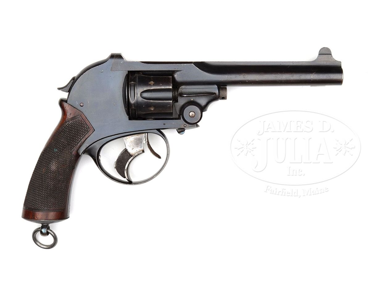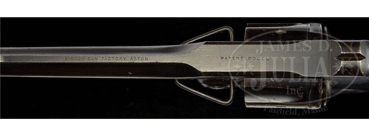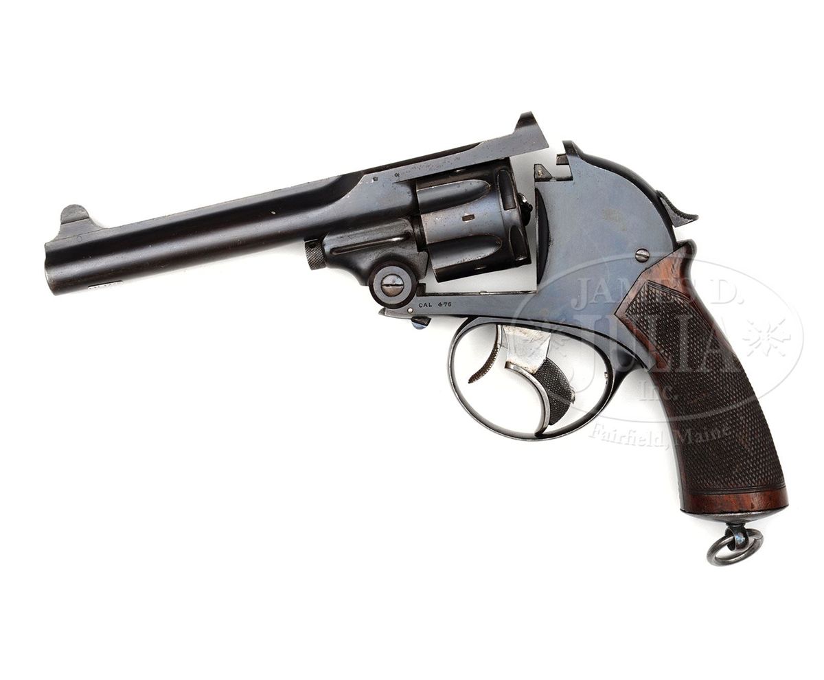 SN 366. Cal. 476. Very rare & unusual British revolver with 6" ribbed bbl, fixed sights with 6-shot fluted cylinder and checkered 1-pc walnut grip with a lanyard swivel in the buttcap. Top rib of the bbl is marked "KYNOCH GUN FACTORY ASTON" and top strap is marked "PATENT MODEL". The Tranter factory was acquired by Kynoch upon William Tranter’s retirement, and managed for them by Harry Schlund, who was granted British patents (9084 in 1885 and 11900 of 1886) for safety revolvers with enclosed hammer and dual triggers, the lower for cocking the hammer, the upper to trip the sear and fire the weapon. This is an example of the second patent type with both triggers within the guard. Only around 600 of both types in all calibres (.380”, .450” & .476”)were produced before the factory ceased production. Left front side of the frame is marked "CAL 476". Revolver is most unusual with enclosed hammer both for safety and to prevent snagging when drawn and an oversize trigger guard which encloses two triggers. Pulling the lower trigger advances the cylinder to the next chamber for firing, locks the rear trigger in place and cocks the hammer at the same time. The upper trigger, which is checkered, is used to fire the cartridge. Top rear of the frame has a checkered thumb latch which is used to tip the bbl down for unloading & reloading. Sides of the bbl lug have triangle shaped wires attached to the ejector housing boss to deflect the holster from jamming the cylinder when re-holstering the pistol. PROVENANCE: Collection of Dr. Geoffrey Sturgess, ex-Visser collection. CONDITION: Very fine to extremely fine. Overall retains about 95-97% satin military style blue with a few very minor, small nicks. Grip has a couple of small chips by the buttcap and a few chipped diamonds, otherwise is sound and retains most of its orig varnish. Mechanics are crisp, bright shiny bore. 4-52489 JR392