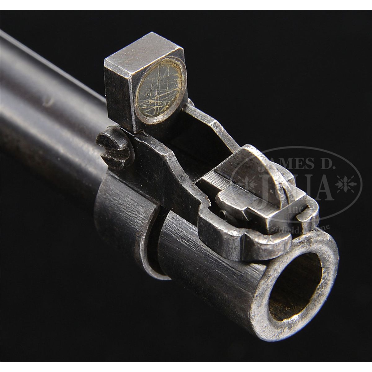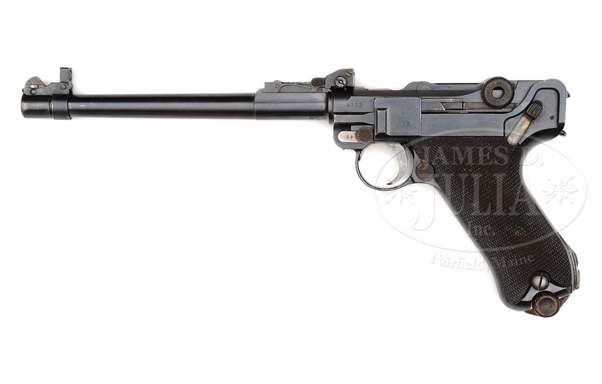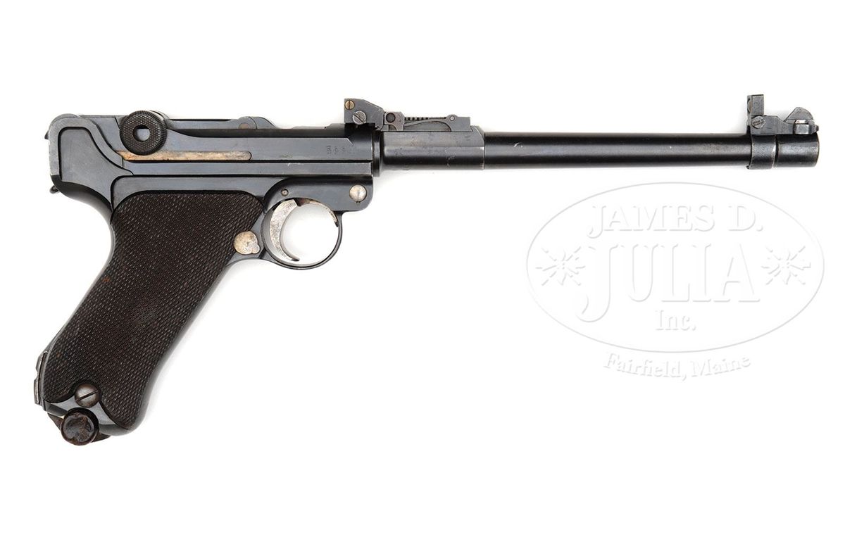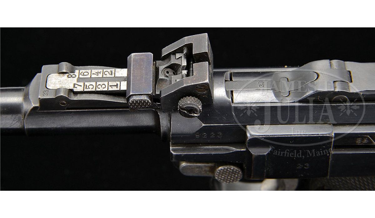 SN 9223. 8" artillery bbl with fine tune front and adjustable fine tune rear sight. "1915" above chamber. "DWM" scroll on center toggle link. All numbered parts on the gun are matching down to the checkered walnut grips. Proper wood bottom magazine has a number that does not match. Fitted with extremely rare Sudicatis luminous sights. Rear sight piece is all machined and surrounds the existing rear sight and secures with screws on each side. Luminous elements (radium based phosphor in glass tubes) appear in windows on each side of the back of the sight. Front sight uses pressed metal location pieces that secure on the bbl and front sight of gun. Luminous element is in a machined block that swivels and secures with a screw. A copy of the original patent for the luminous sight in German from February 1917 is included. This gun/luminous sight system is featured on pp. 1004-1006 of Dr. Geoffrey Sturgess' The Borchardt & Luger Automatic Pistols. One of the earliest attempts to produce a military night-sight. PROVENANCE: Collection of Dr. Geoffrey Sturgess. CONDITION: Excellent retaining 97% orig blue and 80% orig straw with some scattered corrosion. Bore is sharp with frosting. Grips are very good with moderate wear and some chips and dings to the checkering. Magazine is very good with light corrosion on the body and some deep chips and dings to the wood bottom. Sudicatis luminous sights are in excellent condition with little wear and retaining about 98% orig blue with luminous elements still intact. 4-52936 BWS139