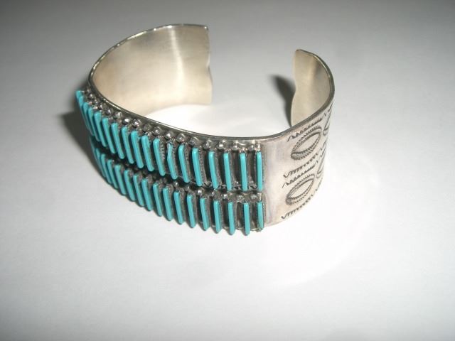 EXTREMELY RARE NATIVE AMERICAN INDIAN *ZUNI TRIBE* SIGNED SILVER & TURQUIOSE BRACELET-SIGNED & STAMPED *R.L. LASTYANO-STERLING* TOTAL WEIGHT OF BRACELET IS 56.25g!! BRACELT HAS 1 TURQUISE PIECE THAT IS CHIPED OFF. INDIAN BRACELET CAME OUT OF SAFE BOX!! ***Coin, Currency & All Items Listed in this auction - Grades, Conditions and Values are not Safe Deposit Coins LLC Responsibilty. Grades, Condition and Values are determined by Consigner(s) & Buyers