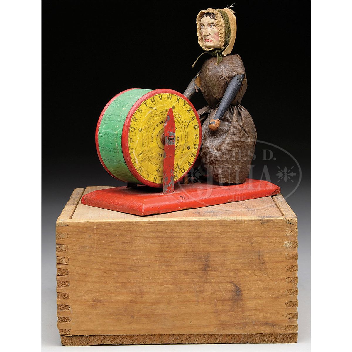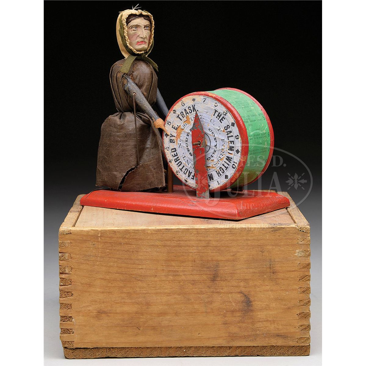 Early patent dates of 1867 & 1868 by Charles T. Ford were filed for this unique and interesting toy. According to the dial, this toy was manufactured by E. Trask and referred to as "The Salem Witch". A "fortune wheel" in front of the witch with numbers 1-17 would indicate your fortune. This cataloger is not sure if this was a child's toy or more of an adult curiosity? The seated figure is dressed in a dark polished cotton outfit and when activating a lever, her hand would spin the wheel and her well detailed wooden painted face would turn from side to side. A remarkable toy in all original condition. Only a handful of these are still known to exist and most likely due to the fact that it was perhaps a dark oddity. SIZE: 6" h x 6" w. PROVENANCE: The Diane and late Steve Olin collection. CONDITION: As stated above, minimal distress to outfit as well as paper on fortune reel. 1-13272