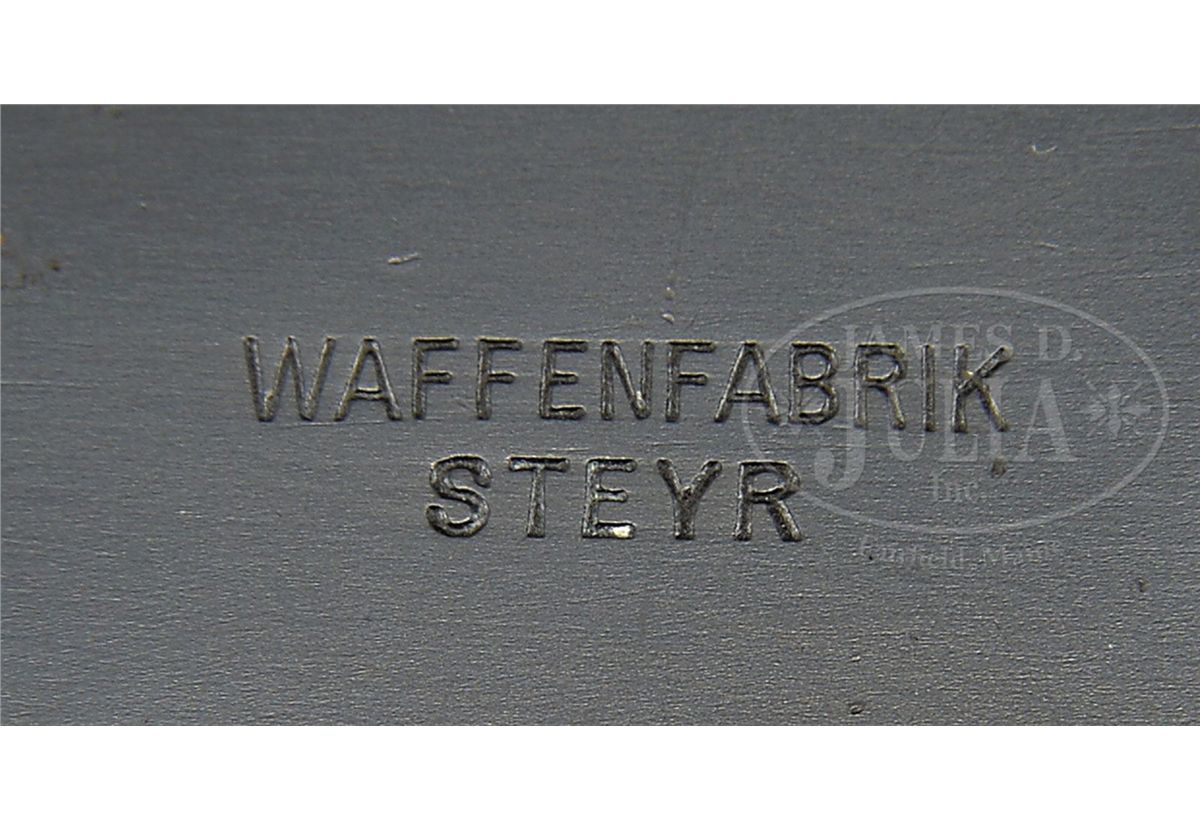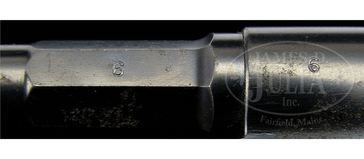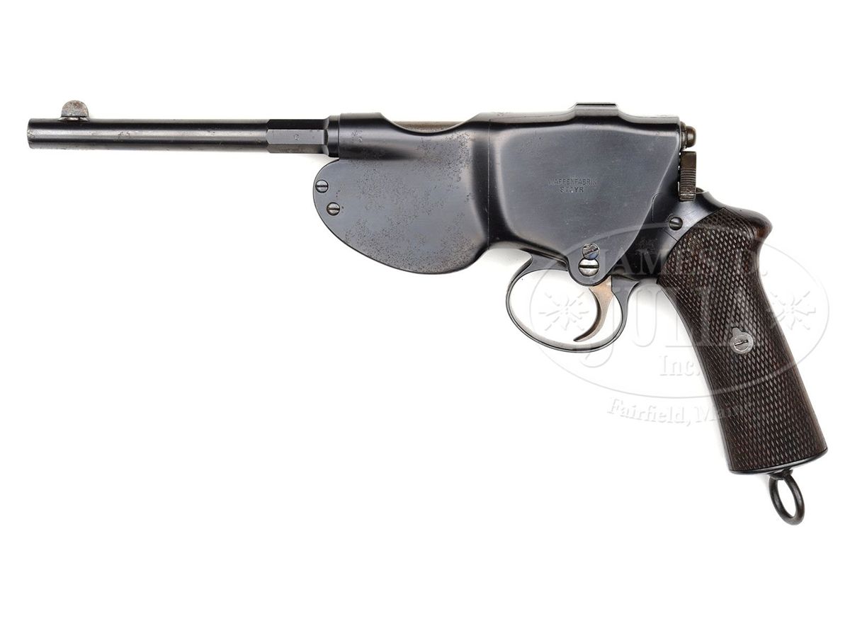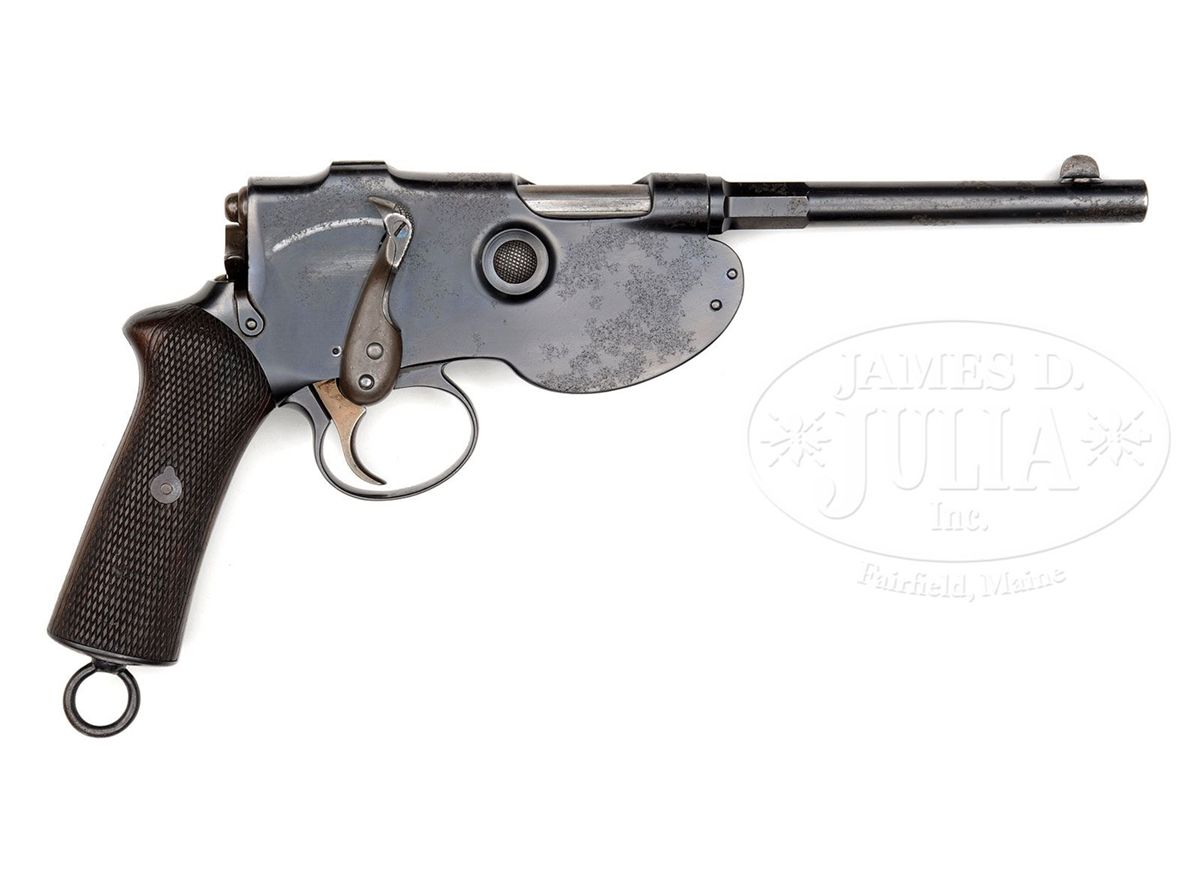 SN 6. Cal. 8mm. In his quest to design a reliable semiautomatic pistol, Josef Laumann made a number of prototypes, most of which were produced for Austrian Army trials, and were never sold commercially. This example of the first pattern Schoenberger-Laumann as 6.5" bbl that assumes an octagonal form 1.25" in front of the chamber with a drift adjustable front sight. SN 6 appears on the left side of the bbl and is repeated on the left side of the frame along with "WAFFENFABRIK STEYR." On the right side is a large cocking lever that retracts the bolt out the rear of the frame. After returning to battery, a cocking indicator (rear of firing pin) extends from the back of the bolt. Just above the tang is a large rotating holdopen/safety whose left side is serrated. Pushing down on the left side releases the bolt and allows the pistol to fire. In front of the cocking lever is a large .5" diameter checkered button, set in a raised escutcheon, that acts as a magazine/clip release. The bbl and frame are rust blued while the bolt and cocking lever are in-the-white. The safety and trigger are strawed. A large rotable lanyard extends from the base of the frame. PROVENANCE: Dr. Geoffrey Sturgess Collection, ex-R.K Wilson collection, illustrated "Textbook of Automatic Pistols", 1st ed, 1943 Ex-Dinely collection, pictured "Vom Ursprung der Selbstladepistole", page 184, 185. CONDITION: 90% original blue with scattered frosting on the left forward frame and on the much of the right side of the pistol. Comparable condition, untouched straw, on the small parts. Original grips with oil darkening and bordered checkering whose color and age are consistent with the appearance of the pistol. An extremely rare and unusual Schoenberger-Laumann prototype that could easily be the centerpiece of any early automatic pistol collection. 4-52460 LMA93