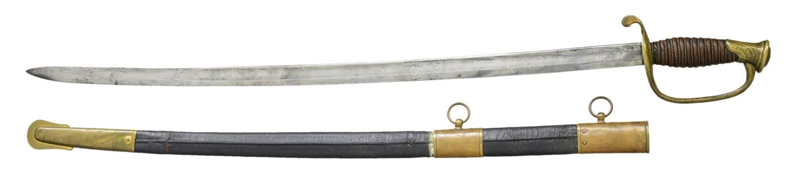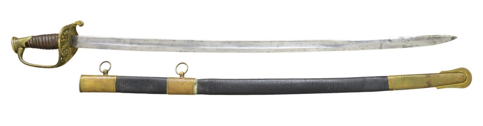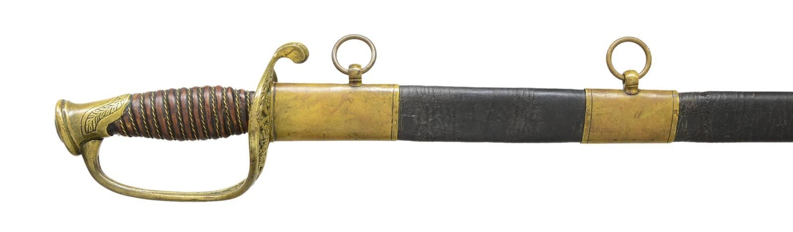 SWORD BY “D. MURRAY, MOBILE, ALABAMA”. Classic Mobile, Alabama made officer’s sword with gold plated hilt decorated with “CS” in oval. 31.25" half round top edge blade is etched with arabesques and floral motifs with vacant presentation panel. Ricasso is incise etched “D. Murray / Mobile”. This unique example surfaced about 30 years ago and still to this day is among the highest finish of Mobile made Confederate swords by maker’s such as James Conning or Louis Bissonnet. Rarely are the castings as crisp or gilted like this example. CONDITION: very good overall. Hilt & pommel retain strong traces of gilt especially in protected areas. The classic “swelled” Mobile style grip retains virtually all its original leather grip and twisted wire wrap. The blade is gray/bright with scattered areas of light pitting, some luster still present in the 15" etched panels which were extremely light to start with. Dry pencil etched makers mark all discerned. The accompanying scabbard is sound and fits sword well, drag is not original to scabbard but color matches well with traces of gilt. (02-14820/JS). $8,000-12,000.