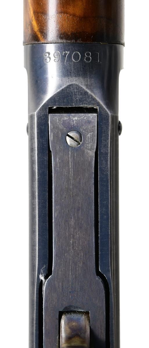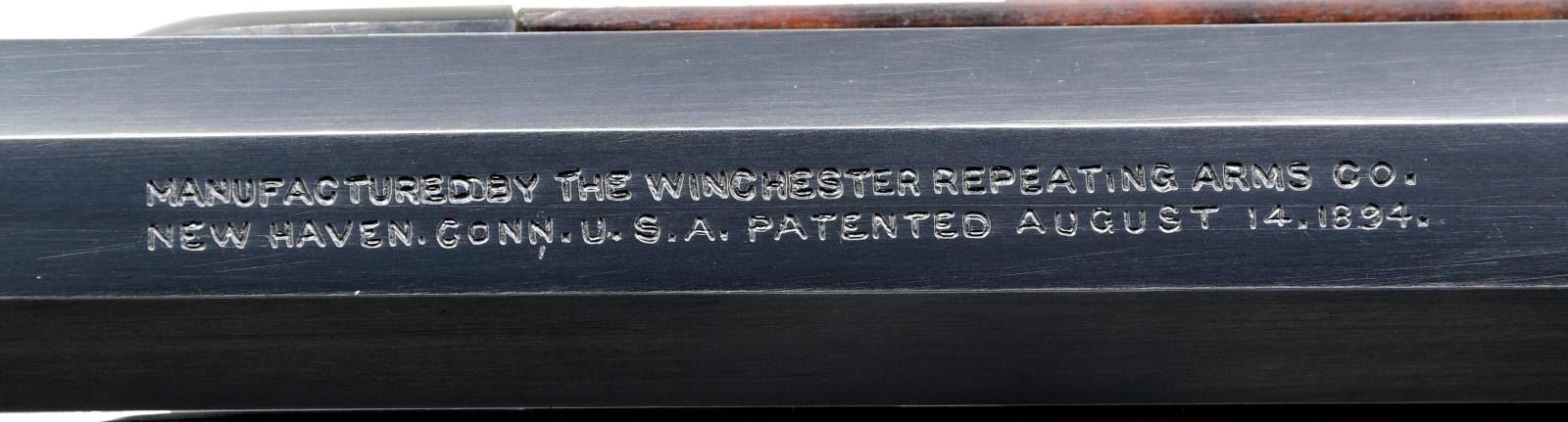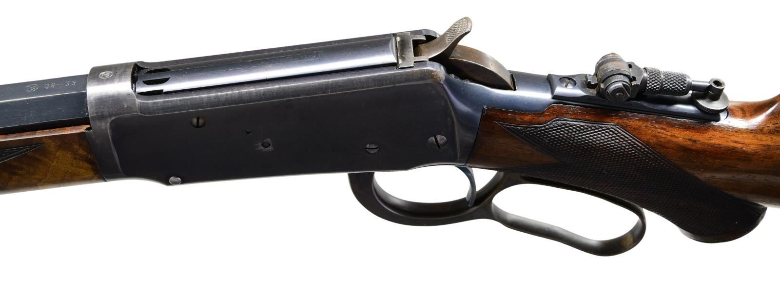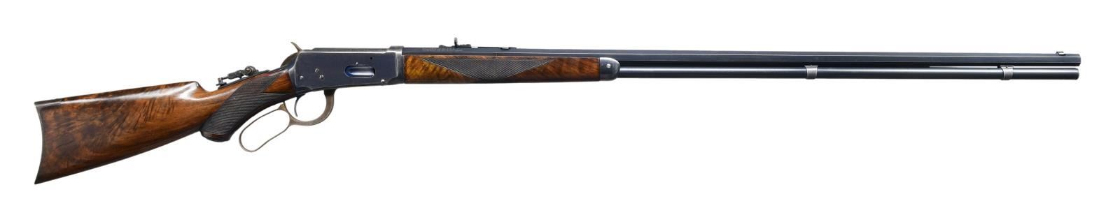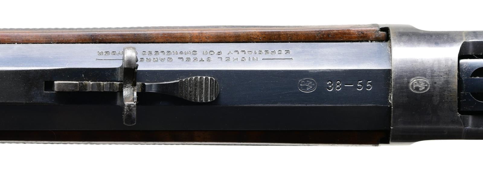 STYLE LEVER ACTION RIFLE. Cal. 38-55. S# 397081. Bbl. 34" octagon. Sporting front sight w/ elevator adj. sporting rear sight & Marble combination tang sight. Full length tubular mag. is held by 2 bands. Blue finished w/ case colored hammer & lever. Forearm & pistol grip deluxe style replacement stock of XXX fancy black walnut w/ grain very typical of deluxe Winchesters of the period. Features include hard rubber grip cap, crescent steel buttplate & hand checkering done in the factory style H. S# indicates 1907 mfg. "Armax" the journal of the Cody Firearms Museum, vol. VI shows a survey of Winchester 1894 records S# 1-353999. Model 1894 records after that S# were destroyed by a factory fire in the 1960s. The survey of existing records lists only 2 34" model 1894 rifles as being produced. CONDITION: bbl. & mag. tube retain over 95% blue showing edge wear w/ apparent touch up around scattered small marks. Receiver retains over 80% blue showing edge wear w/ areas of fading. Hammer & lever retain over 80% nicely visible case colors. Wood has good finish & checkering. Butt section of stock shows some open grain checks. Bright bore retains strong rifling. (24-2121/DS). CURIO. $32,500-45,000.