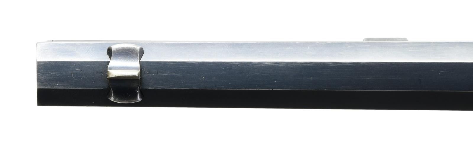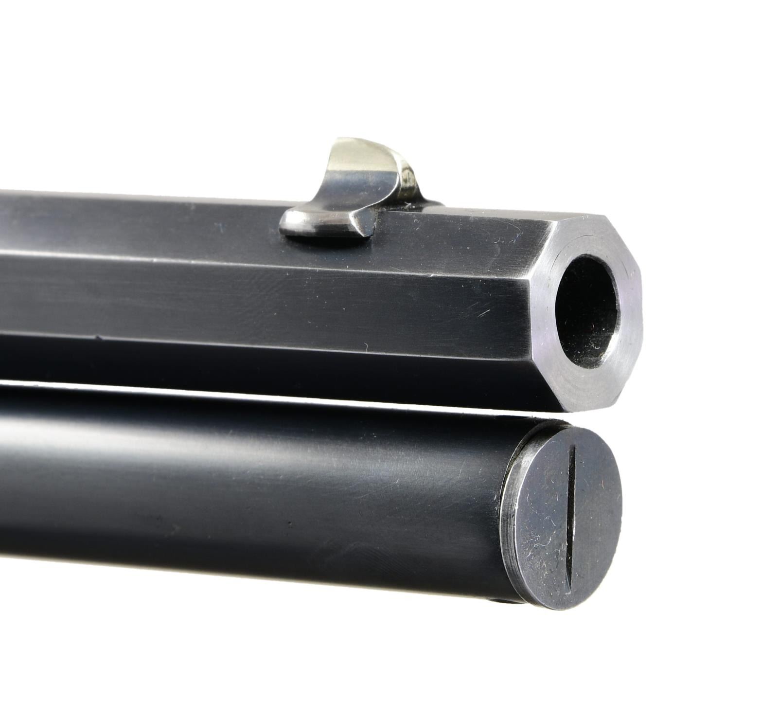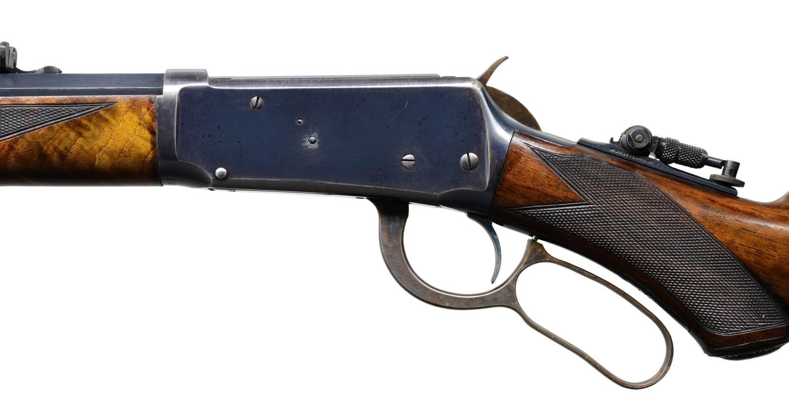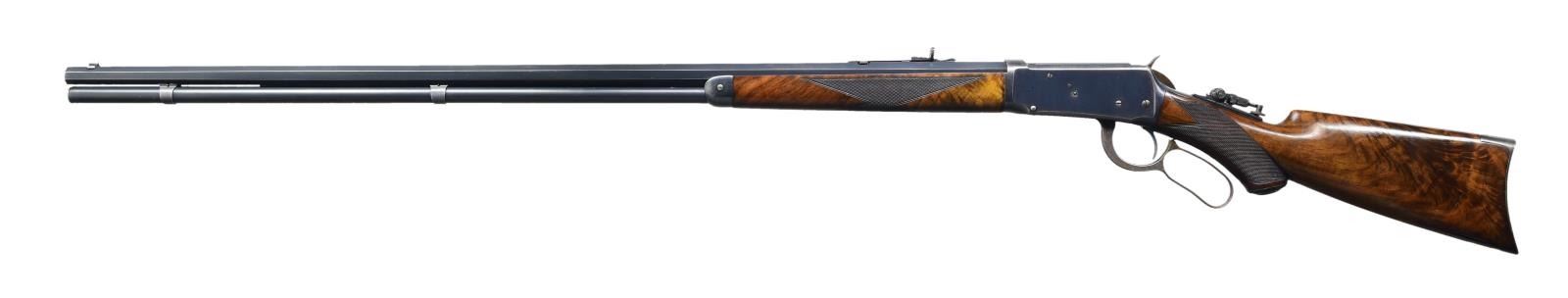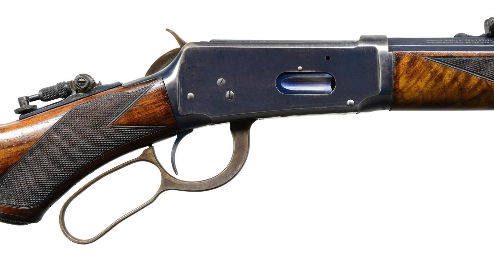 STYLE LEVER ACTION RIFLE. Cal. 38-55. S# 397081. Bbl. 34" octagon. Sporting front sight w/ elevator adj. sporting rear sight & Marble combination tang sight. Full length tubular mag. is held by 2 bands. Blue finished w/ case colored hammer & lever. Forearm & pistol grip deluxe style replacement stock of XXX fancy black walnut w/ grain very typical of deluxe Winchesters of the period. Features include hard rubber grip cap, crescent steel buttplate & hand checkering done in the factory style H. S# indicates 1907 mfg. "Armax" the journal of the Cody Firearms Museum, vol. VI shows a survey of Winchester 1894 records S# 1-353999. Model 1894 records after that S# were destroyed by a factory fire in the 1960s. The survey of existing records lists only 2 34" model 1894 rifles as being produced. CONDITION: bbl. & mag. tube retain over 95% blue showing edge wear w/ apparent touch up around scattered small marks. Receiver retains over 80% blue showing edge wear w/ areas of fading. Hammer & lever retain over 80% nicely visible case colors. Wood has good finish & checkering. Butt section of stock shows some open grain checks. Bright bore retains strong rifling. (24-2121/DS). CURIO. $32,500-45,000.