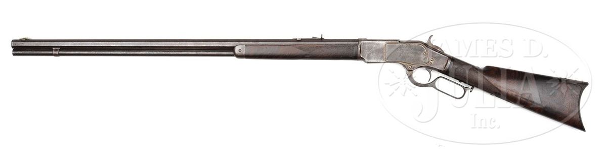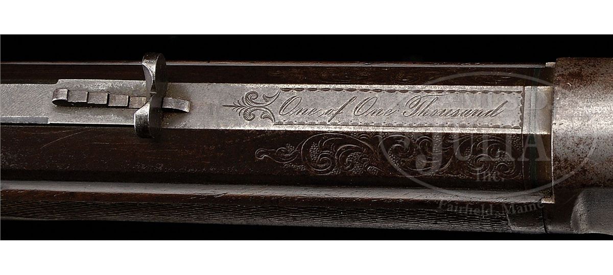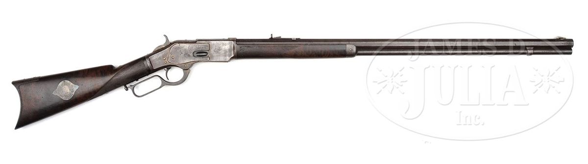 SN 25827. Cal. 44 WCF (44-40). First model, 2nd type '73, with 30" oct bbl, full magazine, German silver Rocky Mtn. front sight and early style, short, semi-buckhorn rear sight with checkered edges. Receiver is first type with second type impressed thumbprint mortised dust cover. Mounted with 3-4/X center crotch, flame grain American walnut that has early style checkered forearm and straight stock with crescent steel butt plate. Right side of buttstock is inlaid with an unusual shaped silver plaque that is mostly round with pointed ears front & rear, 2-1/4" wide x 1-5/8" high, secured with five pins and beautifully engraved in acanthus & foliate patterns, with a blank initial panel in the center. Center is hand-scratched with two sets of initials which appear to be "CGB" and "CDB". There is also an "R" on front ear. Receiver has sgl set trigger. Left side of lower tang is marked with assembly number "191" which number is also found in top tang channel of buttstock and inside toe of buttplate. Bbl, over the chamber area, is engraved in typical '1 of 1000' style, having foliate arabesque patterns on the top, side and side flats and in script "One of One Thousand". There is also a silver band adjacent to the receiver and another around the muzzle. Top flat and all exposed flats around muzzle are engraved to match. Accompanied by Cody Firearms Museum letter which identifies this rifle with 30" oct bbl, set trigger, checkered stock, case hardened, '1 of 1000', received in warehouse March 7, 1877 and shipped March 8, 1877 to Order #8474. The book The Story of The Winchester 1 of 1000 and 1 of 100 Rifles, Lewis, on p. 25 lists this rifle by SN with the above information. It also lists SN 25829 in identical configuration, shipped same day to same order. Pages 60 & 61 of the referenced publication discusses SN 25829 and pictures it with a windage adjustable Beech's front sight and thick base tang sight. The caption states that #25829 was found in a second hand store in Redding, CA "where it lay among numerous junk guns". This rifle, SN 25827, was similarly found, only very recently, in a small gun collection in Kentucky. According to a chart on p. 58 of Winchester The Golden Age of American Gun Making and the Winchester 1 of 1000, Wilson, of the 133 '1 of 1000' Models 1873, there were only thirteen with 30" bbls; 111 were case hardened, 112 were checkered, 120 had set triggers, along with other unassociated information. Page 84 of the Wilson book also pictures #25829. Both of the referenced publications state that there were 132 or 133 '1 of 1000' rifles produced out of the approx. 720,000 Models 1873 manufactured between April 1875 and April 1893. Only a few of the '1 of 1000' rifles out of that total are known today. CONDITION: Very good to fine, all matching. No orig finish remains being an overall mottled plummy/brown patina on the bbl, magazine tube & forend cap; receiver has been lightly cleaned with a thin mottled brown patina and traces of silvered case colors; lever, hammer & buttplate are also a dark brown patina with pitting on heel & tang of buttplate; set trigger needs adjusting and the dust cover may be an old replacement but, regardless, it is orig Winchester equipment. Stock has some tiny chips in the toe and a hairline in stock back of top tang, otherwise wood is sound showing heavy wear on the checkering with light nicks & scratches and retains a hand worn patina. Plaque in the right side is dark oxidized silver. Hammer will not hold at full cock when operated by the lever but will hold when cocked manually, otherwise mechanics are fine, strong, sharp bore with fine pitting. This is an opportunity for the collector to obtain an authentic & very real 1873 '1 of 1000' without having to mortgage the property or sell the first born. 4-47859 JR122