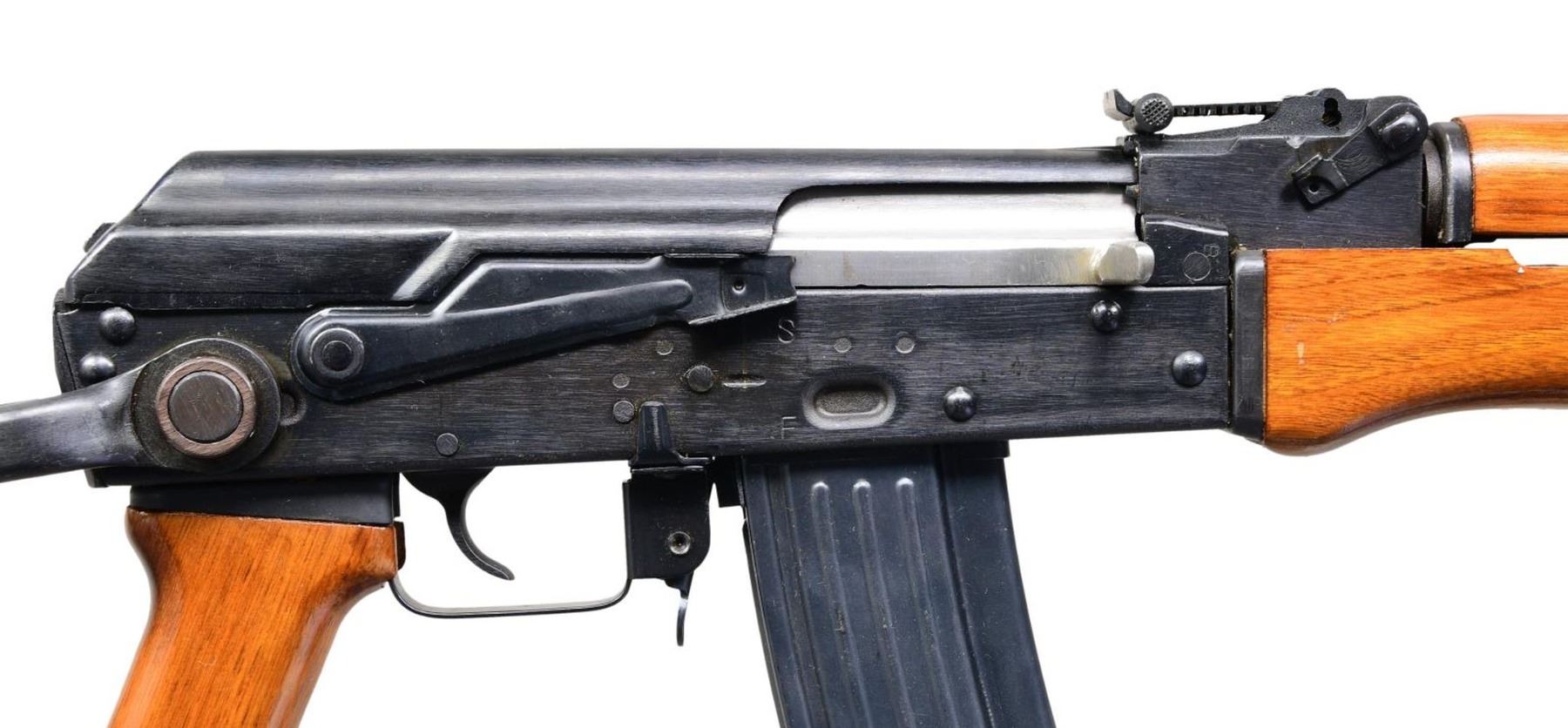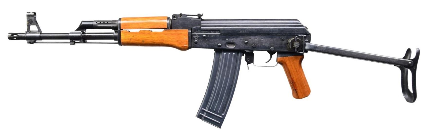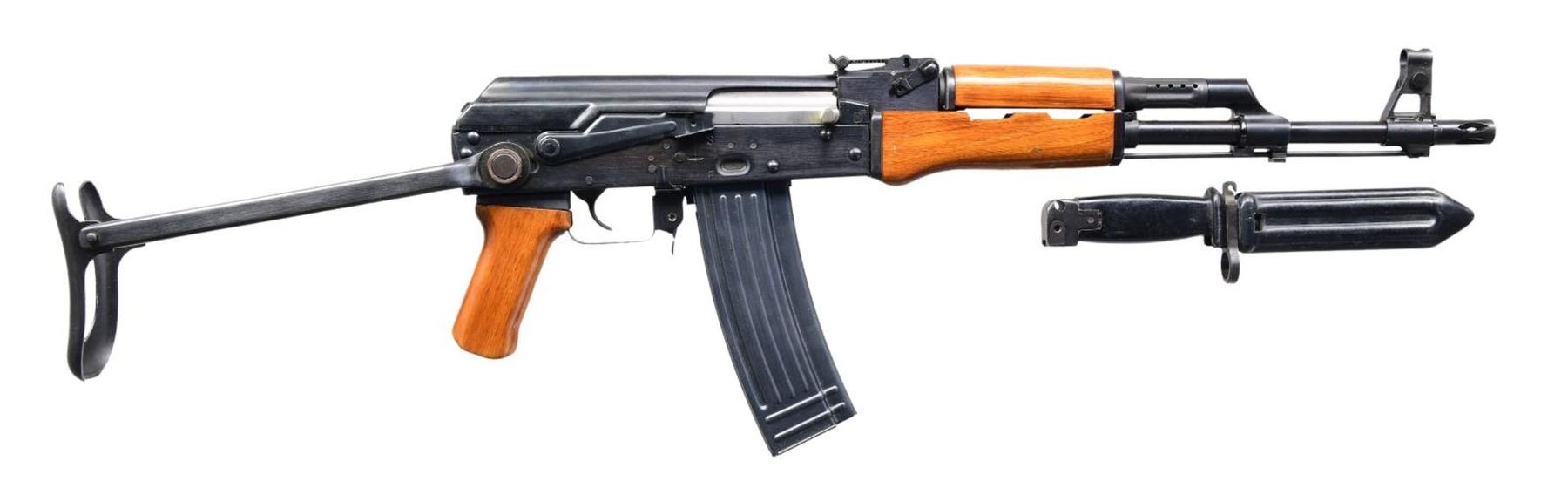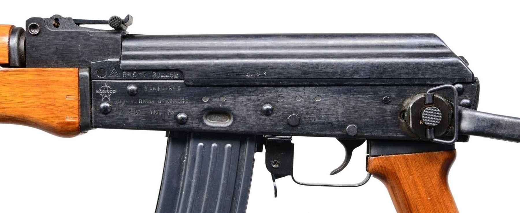 MODEL 84S-1 SEMI-AUTOMATIC RIFLE WITH BOX & ACCESSORIES. Cal. 5.56x45mm. S# 304482. Bbl. 16 1/4". Model 84S-1 semi-automatic rifle mfg. in China by Norinco and imported by CSI of Dallas, TX. Left side of receiver is marked with the Norinco logo, followed by "5.56mmx45" above "MADE IN CHINA BY NORINCO" and CSI's importer information. Trunnion is marked with Factory 66's "66" within a triangle code, followed by the model designation and S#. Metal components exhibit a blue finish overall. Plain wood pistol grip and handguards, with under-folding buttstock. Standard AK pattern front and rear sights, with bird cage flash hider and bayonet lug. All numbers are matching and include the receiver, receiver cover, mainspring guide rod, bolt carrier, bolt, as well as the gas cyl. tube, which is properly electro-penciled on the underside of the tube. MAGS: 1 30-rd. UNATTACHED ACCESSORIES: box containing a styrofoam insert, mag., green canvas web sling, as well as an unserrated bayonet with scabbard. CONDITION: excellent, with metal components retaining bountiful amounts of their original factory blue finish, exhibiting usual superficial marks on the receiver from handling and storage. Bolt carrier exhibits some discoloration on the exposed right flat, with some discoloration and light pitting present on the charging handle. Brilliant mirror chrome lined bore, exhibiting well defined rifling throughout. Wood furniture is excellent, with 2 small indentations on the underside of the bottom handguard from the folding stock. Box shows some mild exterior wear, but otherwise remains sturdy and serviceable. A high condition example of a seldom encountered Norinco Model 84S-1 semi-automatic rifle. (24-1476/MLW). MODERN. $1,800-2,700.