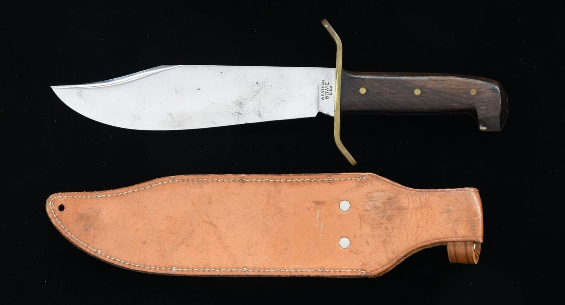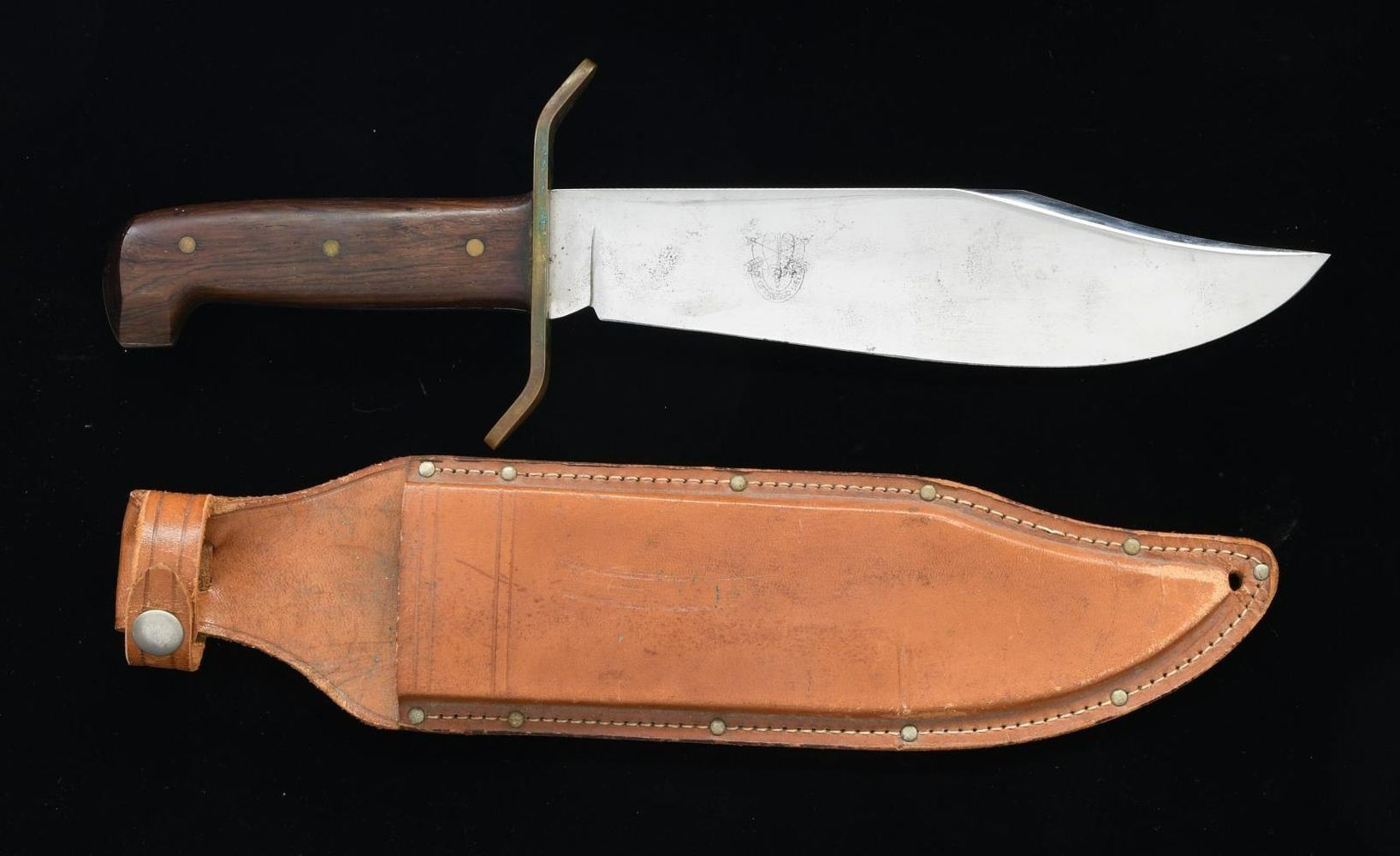 BOWIE KNIFE WITH SCABBARD, ATTRIBUTED TO MAJOR GENERAL JOHN MICHAEL LENTI. 1 of only 100 bowie knives produced by Western Cutlery Co. under special order for the United States Special Forces in 1965. According to a letter from Western Cutlery Co. in 1975, these bowie knives were shipped to Fort Bragg where the Special Forces were training, and further added that the 2 piece handle was comprised of rosewood, as compared to the resin handle found on the standard production bowies. The right side of the clipped point blade is etched with the "DE OPRESSO LIBRE" Special Forces insignia, with "WESTERN/ BOWIE/ U.S.A." marked on the left side of the ricasso. Blade features a bright polished finish. Brass "S" pattern crossguard, with aforementioned rosewood grip panels and brass rivets. Blade measures 9 1/4", with the knife measuring 14 1/2" overall. Unmarked brown leather scabbard. UNATTACHED ACCESSORIES: a 1st Aviation Brigade patch, 1 Infantry Combat badge, 1 Special Forces Group "DE OPRESSO LIBRE" insignia badge, 1 unnamed Good Conduct medal. Also included is several scans from the 3rd Special Forces Group roster (showing then Cpt. John Lenti), a 1998 dated biographical sketch of Major General John Michael Lenti, as well as a 1992 dated signed card "to John" from Congressional Medal of Honor recipient Master Sergeant Roy Perez Benavidez, which is accompanied by a scan detailing the action in which he earned the Medal of honor. CONDITION: blade retains the vast majority of its original bright polished finish, exhibiting some scattered spots of light surface pitting, with some spots of darker discoloration, and some spots of light oxidation overall. Brass guard exhibits a heavy patina, with some spots of verdigris. Steel grip frame exhibits some oxidation and discoloration. Rosewood grip is very good overall, with some mild marks from storage and handling, as well as some mild separation from the metal grip frame on the toe of the left grip panel. Sheath exhibits exterior wear from use, with some spots of age related cracking and mild crazing. PROVENANCE: From the Lifelong Collection of Glen E. Mattox. (02-18478/MLW). $500-800.