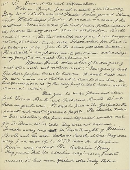 JOHN THRESHER (b.1845) British watchmaker believed to be a co-founder with William Booth of the Salvation Army. Superb content A.M.S. with A.L.S. 1p. 12mo. transmittal letter and holograph envelope signed "John Thresher" and bearing paper "GREAT SEAL OF THE CHURCH OF AMERICA", the manuscript 3pp. 4to., Pittsburgh, Oct. 24, 1917. Thresher writes to reporter E. B. Thompson of the Pittsburgh Sun about the founding days of the Salvation Army. In part: "...William Booth planned a meeting on Sunday July 2nd 1865 in an old Quaker burial ground...he invited me as one of his assistants. I wanted a few of the East London police to protect us, it was the very worst place in all London...Booth said to me: 'The Lord will take care of us...it is Hell's half acre'...We met with a rough welcome. A flint stone made a ding on my face, it is one mark I am proud of. William Booth when asked if he was going back after such mob violence said: 'I am going back till the people learn to love me'...we had flowers given us by the very people who pelted us with stones and rubbish...William Booth and Catherine Booth had one great idea. I was to preach the Gospel to the poorest and most degraded people. The churches failed in that direction...they were not welcome...In 1865 London and other cities were in very bad shape...men, women and children...were in an awful condition, gin palaces...open a large part of Sunday...William Booth and his wife...said to me Your state church fails to reach the worst grade of people...the poor are neglected as also the real vicious and wicked...In [Jesus'] name they worked like slaves outside the churches. The world knows the result...Mrs. Catherine Booth...answer to the Bishop of Carlisle who preached a sermon condemning the army is full of good thought...They worked in much the same way Billy Sunday is working...It was at a meeting in the nature of a conference that William Booth was assigned to a circuit of the [Methodist] church. The church was crowded. Booth was seated on the main floor, Mrs. Booth in the gallery. The one word Never rang through the church, it was the voice of a woman...Catherine Booth...Many claim that was the one important word that laid the foundation for the future and present Salvation Army...Her prayer was for Divine guidance. God spoke to William Booth, the word Never was a message from God delivered by his wife Catherine Booth". Fine condition. Sold with a carbon typed copy of an article on Thresher which contains scant details of this incredible tale.