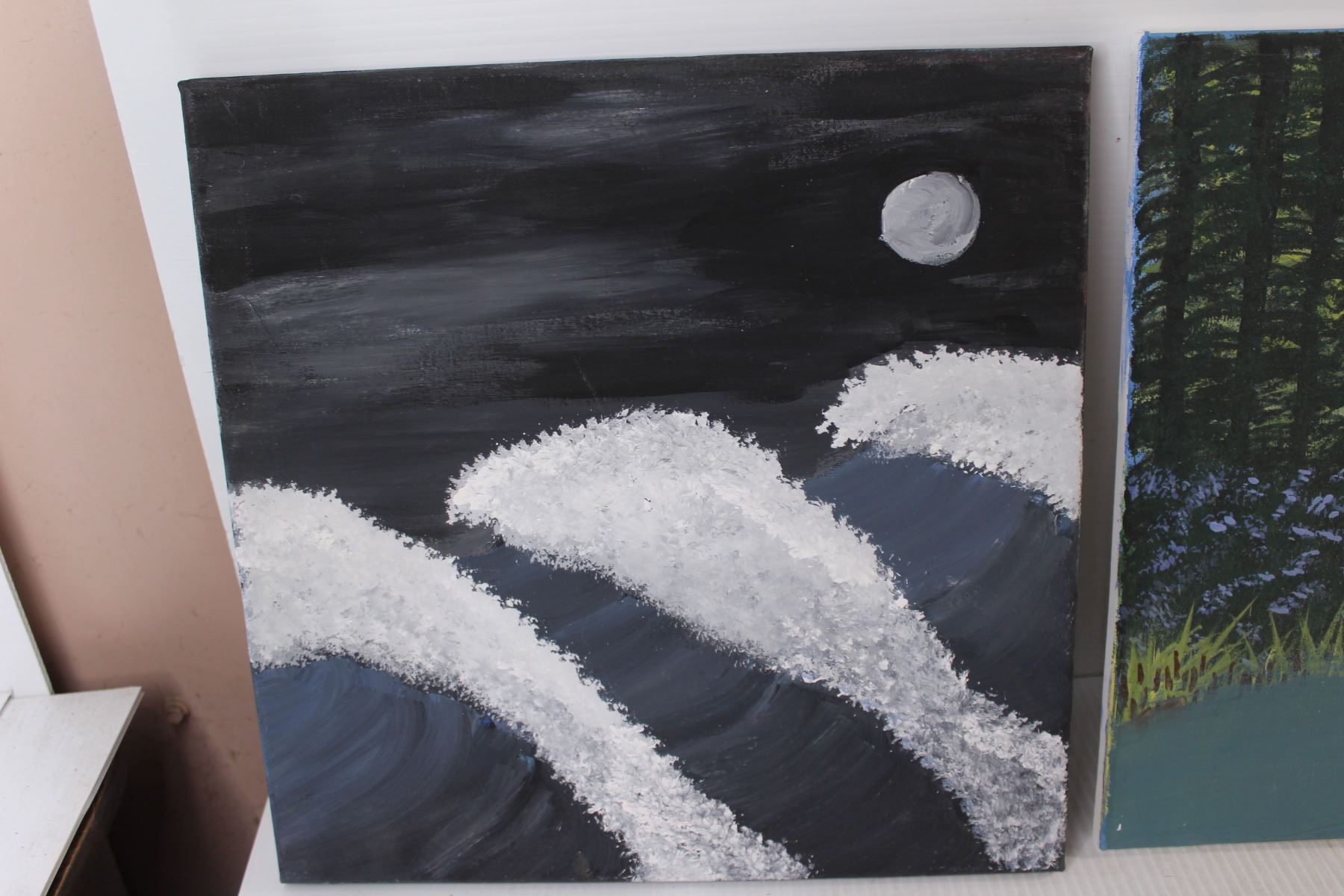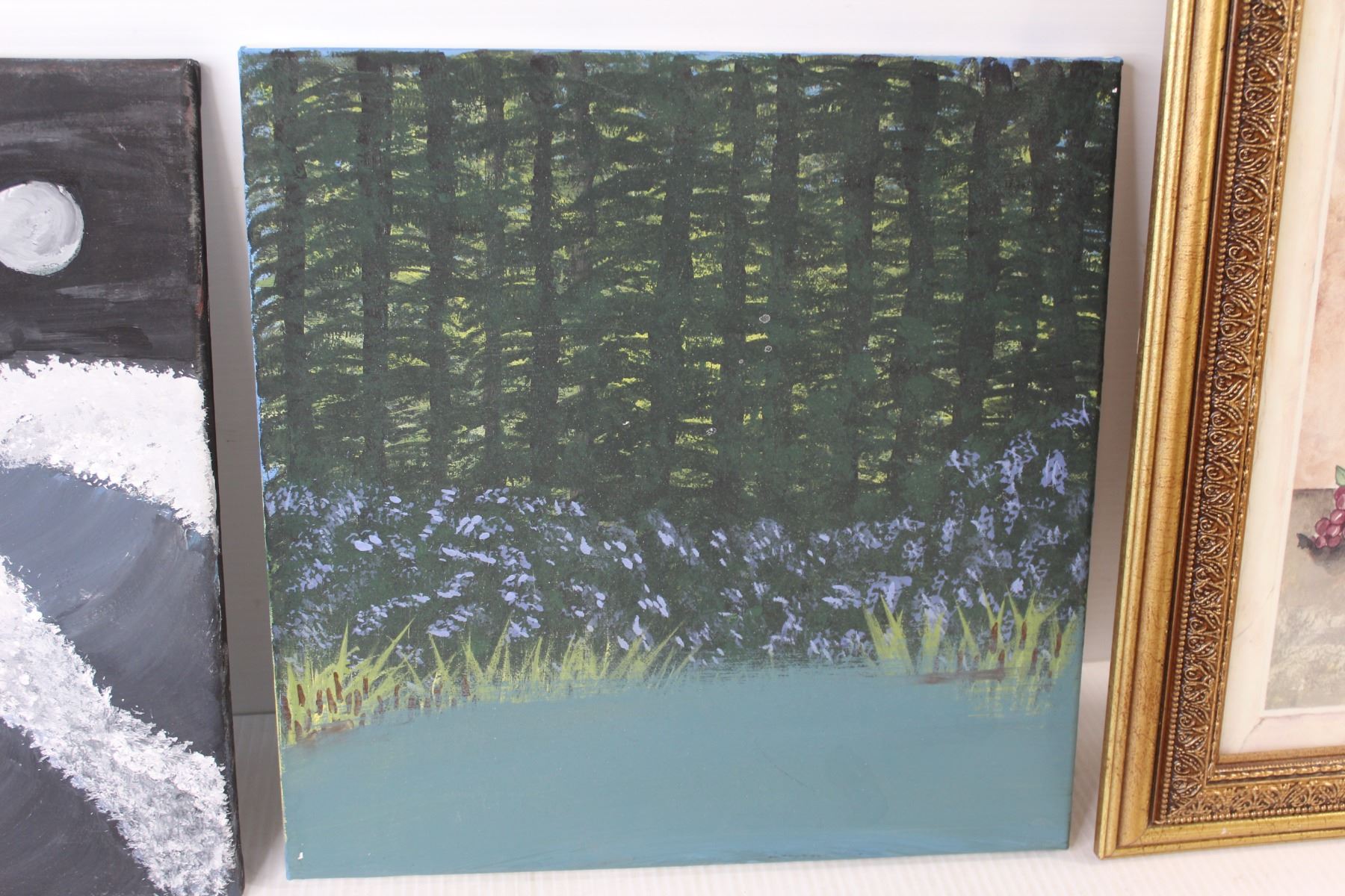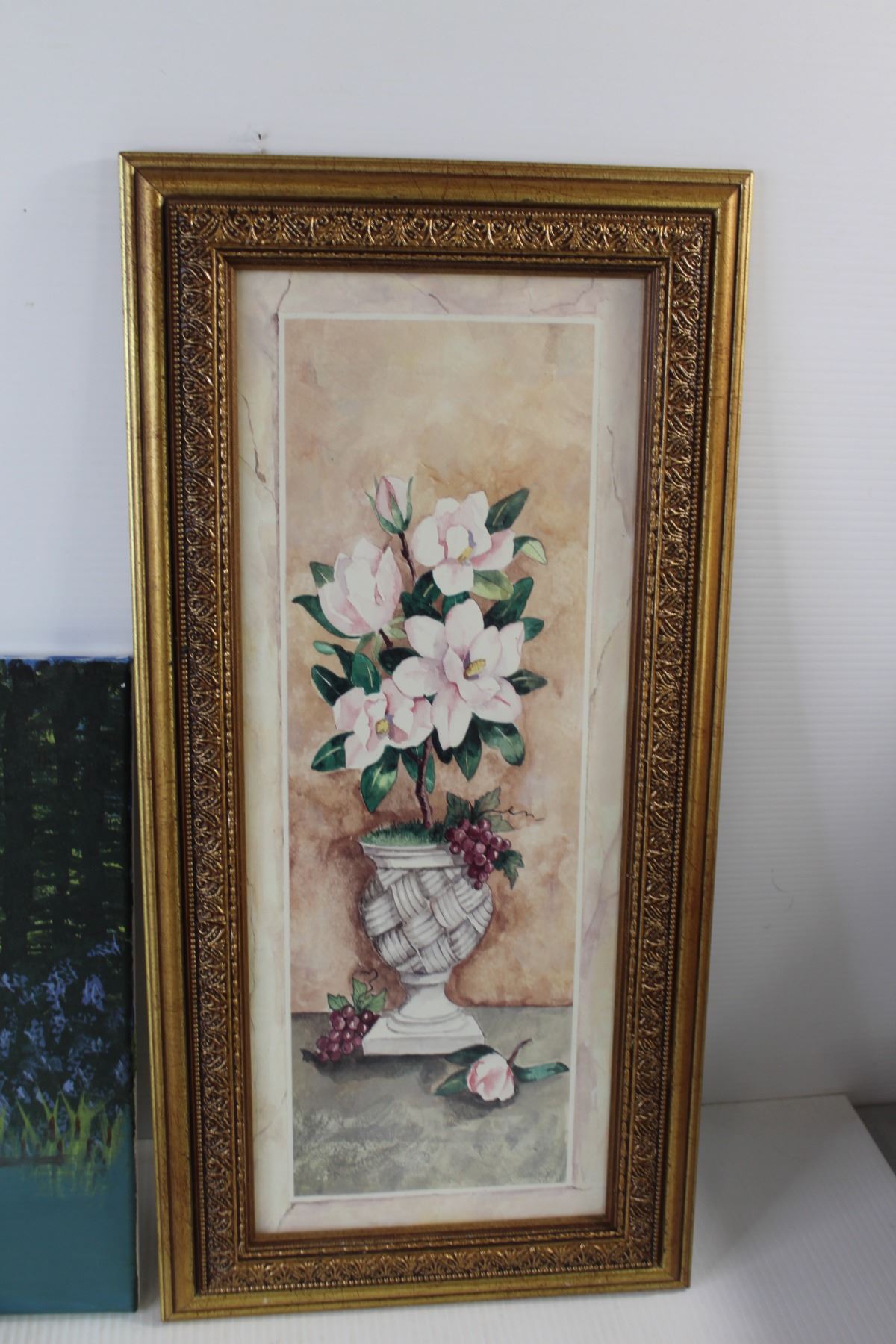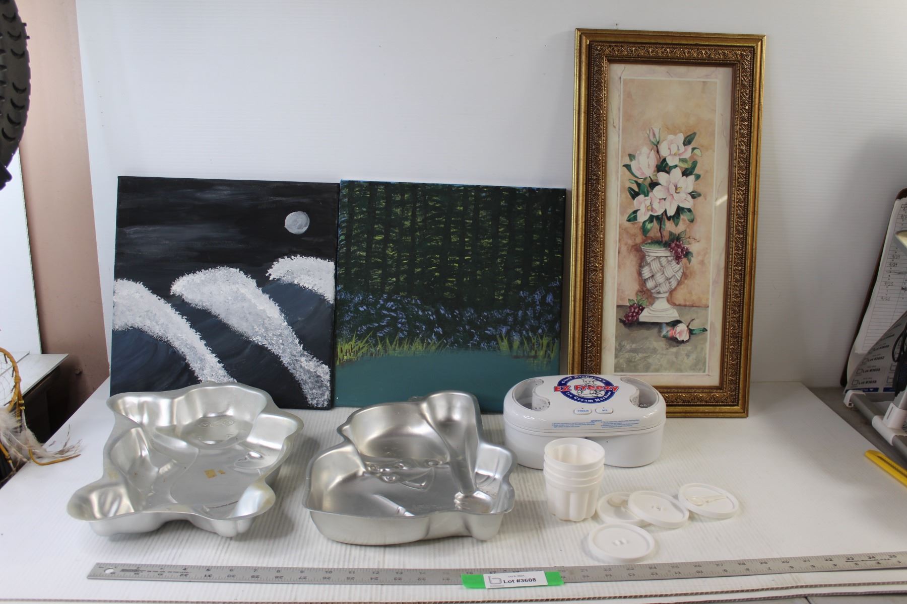 EZ Freezy Ice Cram Machine - As Is, (2) Cake Molds, Flower Painting - 11 1/2" x 24", (2) Canvas Paintings - 14" x 14"