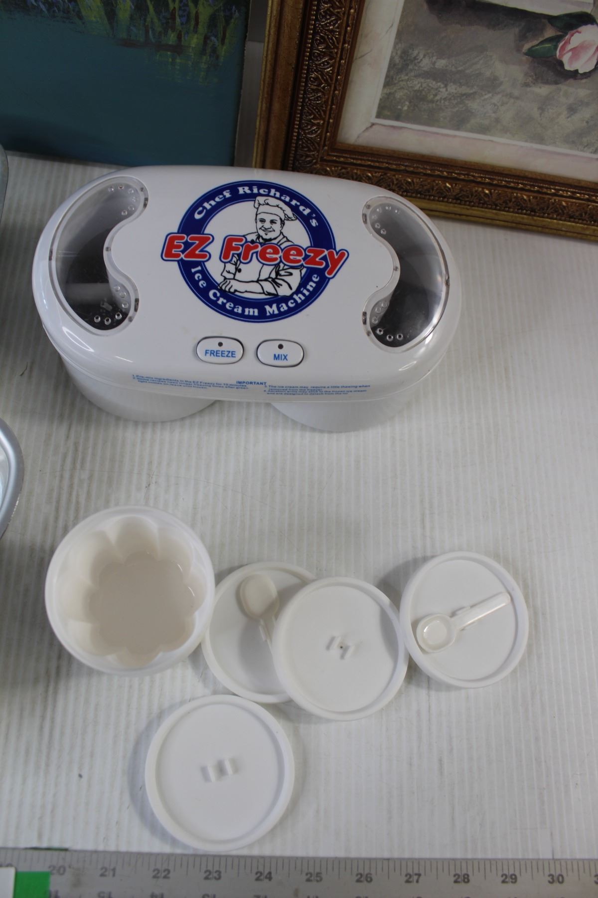 EZ Freezy Ice Cram Machine - As Is, (2) Cake Molds, Flower Painting - 11 1/2" x 24", (2) Canvas Pain