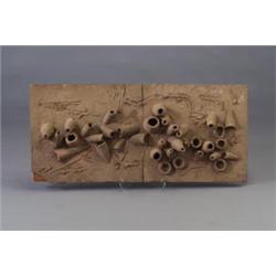 Each of the following three lots was made in the DESIGN TECHNICS architectural tile studio in the 1950s, and is made of clay mounted on plywood backing, possible for further casting in metal. HARA horizontal architectural frieze in brown clay with sliced and arranged conical forms on expressive hand-worked ground. Break to one edge, stress-crack through center. Incised HARA with cartouche. (Provenance: purchased from 50/50 in the late 1970's) 17 1/4" x 47 1/4" $1,200 - 1,600