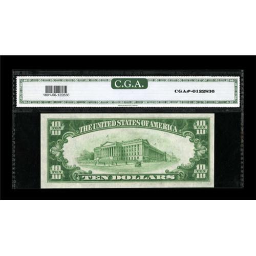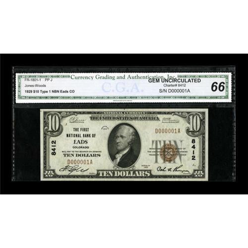 <B>Eads, CO</B></I> - $10 1929 Ty. 1 <B>The First NB</B></I> Ch. # 8412<BR> A pleasing serial number 1 example from a popular state cut from a recently sold uncut sheet. <B>CGA Gem Uncirculated 66.</B></I><BR><BR><b>Shipping:</b> Coins & Currency (<a target="_blank" href="http://www.heritageauctions.com/common/shipping.php">view shipping information</a>)