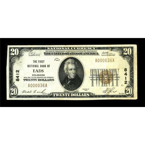 <B>Eads, CO</B></I> - $20 1929 Ty. 1 <B>The First NB</B></I> Ch. # 8412<BR> A nice small example from the first of the two banks chartered here. <B>Very Fine,</B></I> with just a bit of light staining visible mostly on the back. <BR><BR><b>Shipping:</b> Coins & Currency (<a target="_blank" href="http://www.heritageauctions.com/common/shipping.php">view shipping information</a>)