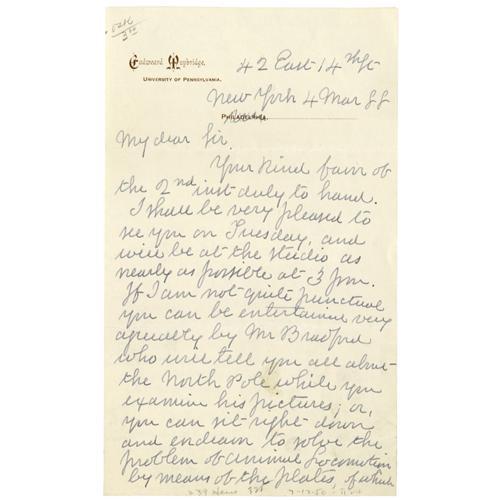 <B> Eadweard Muybridge Autograph Letter Signed </B></I> <I> "E. Muybridge." </B></I> Two pages, 5" x 8", personal letterhead, New York, March 4, 1888. Written to Frank W. Hoyt Esq., the letter reads in part, <I> "…If I am not quite punctual you can be entertained very agreeably by Mr. Bradford who will tell you all about the North Pole while you examine his pictures; or, you can sit right down and endeavor to solve the problem of Animal Locomotion by means of the plates, of which you will find nearly 800 awaiting your inspection…" </B></I> Muybridge was responsible for developments in photography which eventually helped lead into the birth of the motion picture. He used multiple cameras to capture motion and he was the man who proved that when a horse runs, there is a point at which all four of the horses hooves are off the ground. <r The letter is in fine condition; usual folds are present; small stain in the center of the letter on the verso; signature is bold and dark. The content and signature in this letter is superb! From the Henry E. Luhrs Collection. Accompanied by LOA from PSA/DNA.