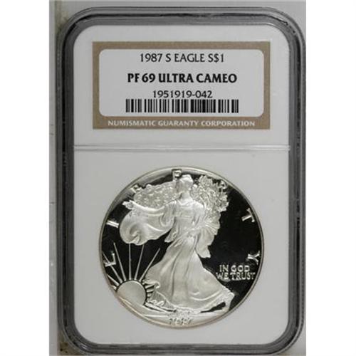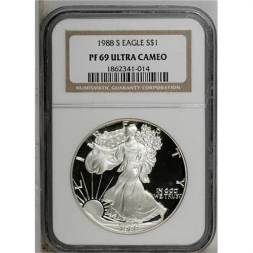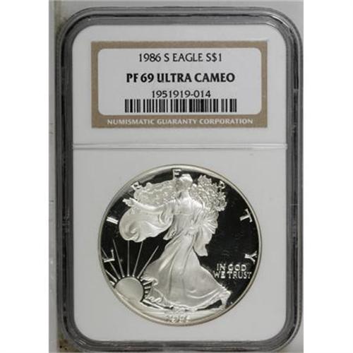 <B>1986-S S$1 Silver Eagle PR69 Deep Cameo NGC.</B></I> the set includes a <B>1987-S PR69; 1988-S PR69; 1989-S PR69; 1990-S PR69; 1991-S PR69; 1992-S PR69; 1993-P PR69; 1994-P PR69; 1995-P PR69; 1996-P PR69; 1997-P PR69; 1998-P PR69; 1999-P PR69; 2000-P PR69; 2001-W PR69; 2002-W PR69; 2003-W PR69; 2004-W PR69; and a 2005-W PR69.</B></I><BR><BR><b>Shipping:</b> Coins & Currency (<a target="_blank" href="http://www.heritageauctions.com/common/shipping.php">view shipping information</a>)
