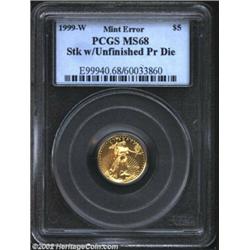Eagle $5 1999-W MS68 PCGS. The 1999-W $5 gold bullion coin was supposed to be a proof-only issue, but one die pair went into service without due preparation for striking proofs. PCGS has certified this coin as a business strike. The mint also made a similar mistake that year with the $10 gold bullion coin. Well struck with a pristine reverse and minor strike doubling on LIBERTY. Important notice: We expect to be auctioning lots at the rate of 200-250 per hour. Sometimes eBay Premier live bid software cannot keep up with that pace, so we strongly recommend that you place a realistic proxy bid now as insurance to avoid disappointment. Also please note that all Heritage/CAA lots purchased through eBay Premier carry a 20% Buyer's Premium. Please make sure you read the Terms and Conditions.