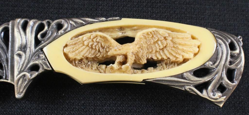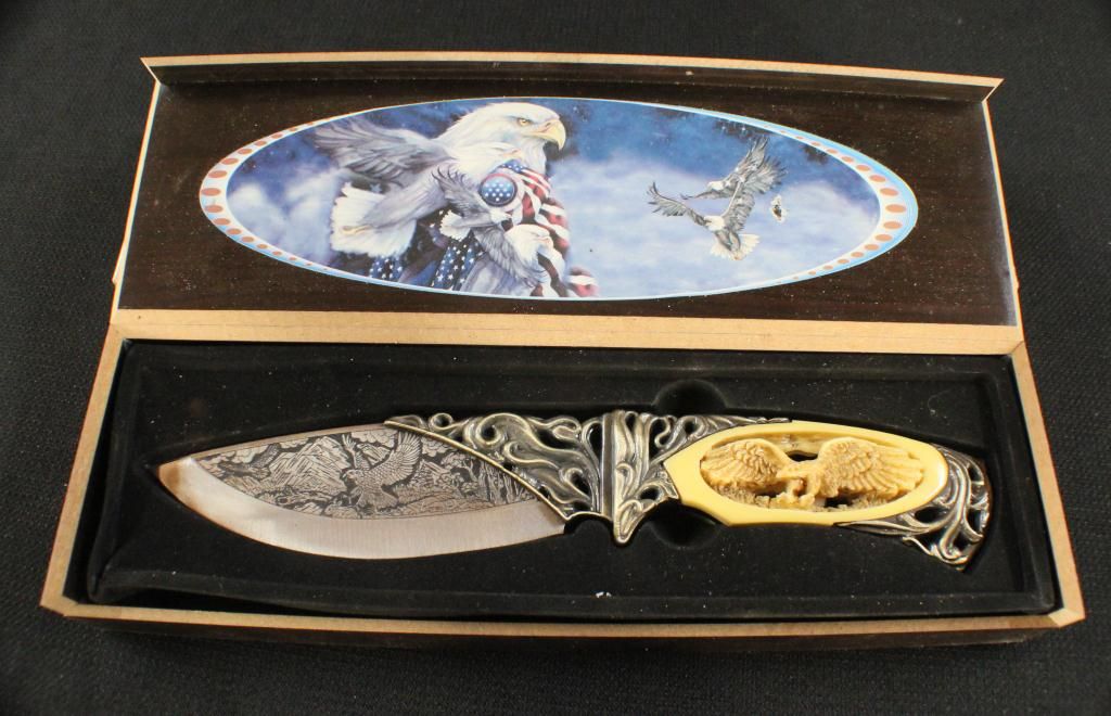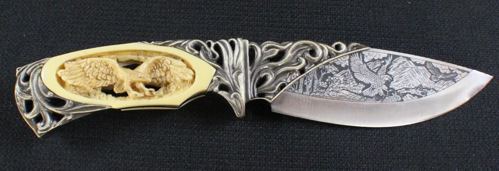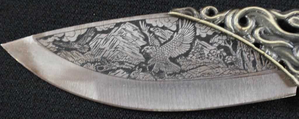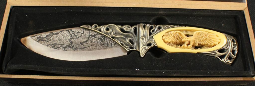 Carved Eagle Handle, Latticework Metalwork On End Of Handle & Connecting To Blade. Stainless Blade Is Etched With Wildlife Eagle Artwork. Comes In Wood Display Box
