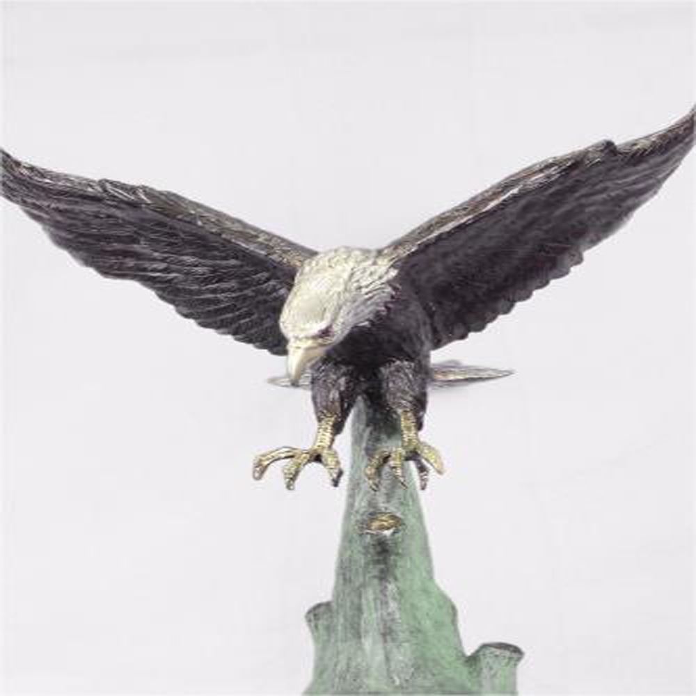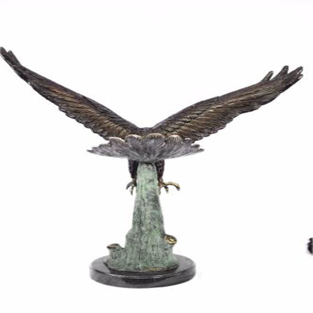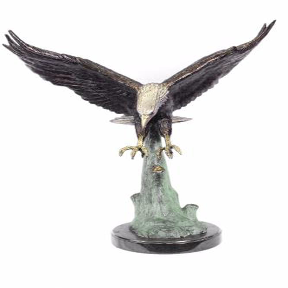 This is a beautifully detailed Sculpture of the American bald Eagle. It swoops down from the sky and spreads it is wings and claws to grasp a nearby branch. He swoops down and is versatile in this method of travel, reaching speeds of 56 - 70 Kilometers Per Hour (3543 MPH) when gliding. His head and tail have a brilliant silver patina, his body a two-tone brown, and his claws and beak a bright gold. He is a magnificent recreation of this powerful creature and the National symbol of the U.S.A. He represents resilience, power, and strength but mostly it represents Freedom. He jumps off of a large broken tree that has a multi-colored patina, his eyes red and each feather detailed, making it all look extremely realistic. This bronze Sculpture was using the ancient Lost Wax Method and sitting on a marble base. Dimensions: Height 31 X Width 28 inches. Weight: 45 LBS.
