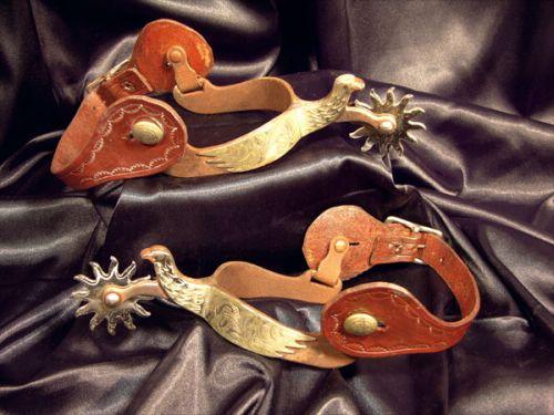 Eagle Head Spurs, single mount silver overlay. Tooled leather. Good condition.