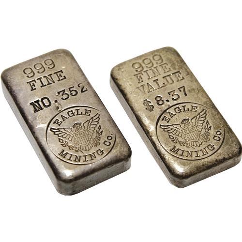 <B>Eagle Mining Co. Silver Ingots.</B></I> The Eagle Mining Co. ingots first surfaced in about 1969. Much has been said of these ingots, some real, and some quite inventive. There are interesting attributes in common to all the Eagle ingots. They are all the product of refining, 999 fine. Each is not consistently marked in the same manner, with fineness in one place, serial number and value in another. Further, the word "value" is used, which is redundant when a dollar sign is present. It is only rarely used, generally in the case of a dore' ingot with mixed gold and silver, and generally for exhibition ingots. The eagle used in the vignette is strikingly similar to, and apparently patterned after, the post-WW II U.S. Mint ingots, a commonality far too striking to be ignored.<BR> These ingots possess common attributes that can only result in a single conclusion, that they were made for the bullion market, probably after the demonetization of silver in 1964. They were, and continue to be, very collectible precious metal ingots.<BR> Mining company ingots are generally not refined. They are dore, a natural bullion product from the mine, carrying the gold and silver (and sometimes copper, antimony, etc.) as it is found in nature at the mine. In this case, the reference to "Mining Co." is possibly an early marketing ploy.<BR><I>From The Kagin Reference Collection of Frontier Ingots.</B></I>