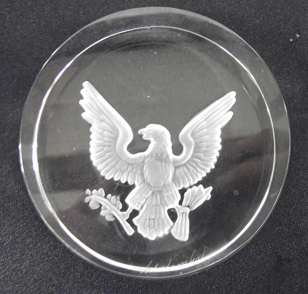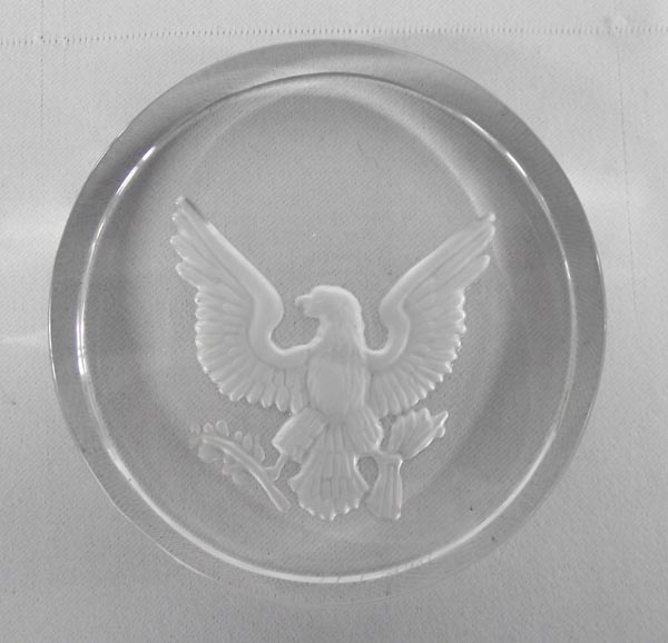 Eagle Paperweight. Clear glass with indented Eagle on bottom. Measures approx. 1''H x 3 1/4''Diameter. Buyers Pay Actual Shipping and Handling Charges(see terms and conditions for more information).