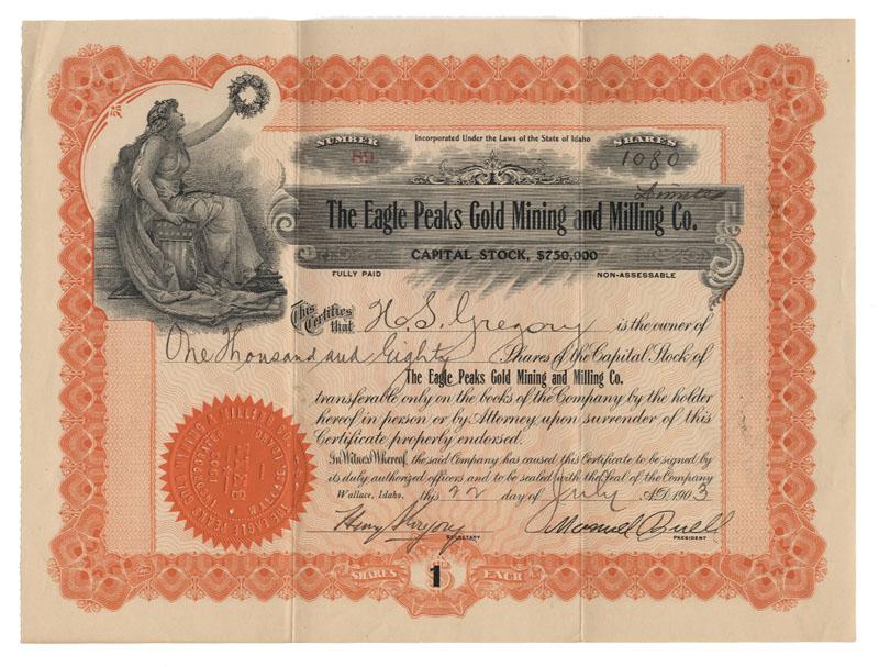 1903, Idaho. Stock certificate for 1080 shares. Orange/Black. Vignette at top left of a seated lady liberty holding a laurel wreath. Folds. Uncancelled and fine.