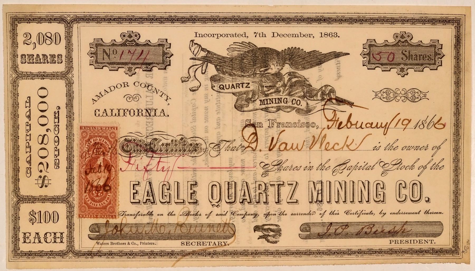 Amador County, California (printed at left). Inc. Dec. 7th, 1863. No. 174, issued for 50 shares to D. Van Vleck (an artist and lithographer) on Feb. 19th, 1866 in San Francisco. Signed by president JP Bush and secretary John Burnett. Not cancelled. Black border and print. Two eagle vignettes. Printed by Waters Brothers & Co., printers. 25 cent adhesive revenue stamp attached at left. Folds, light wear. 5.5 x 9.5" Jonathan P. Bush is listed as a physician in the 1867 SF Directory. John Burnett is listed as an attorney. No additional information could be located about this company.