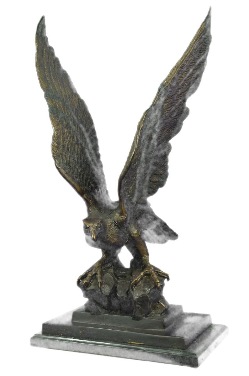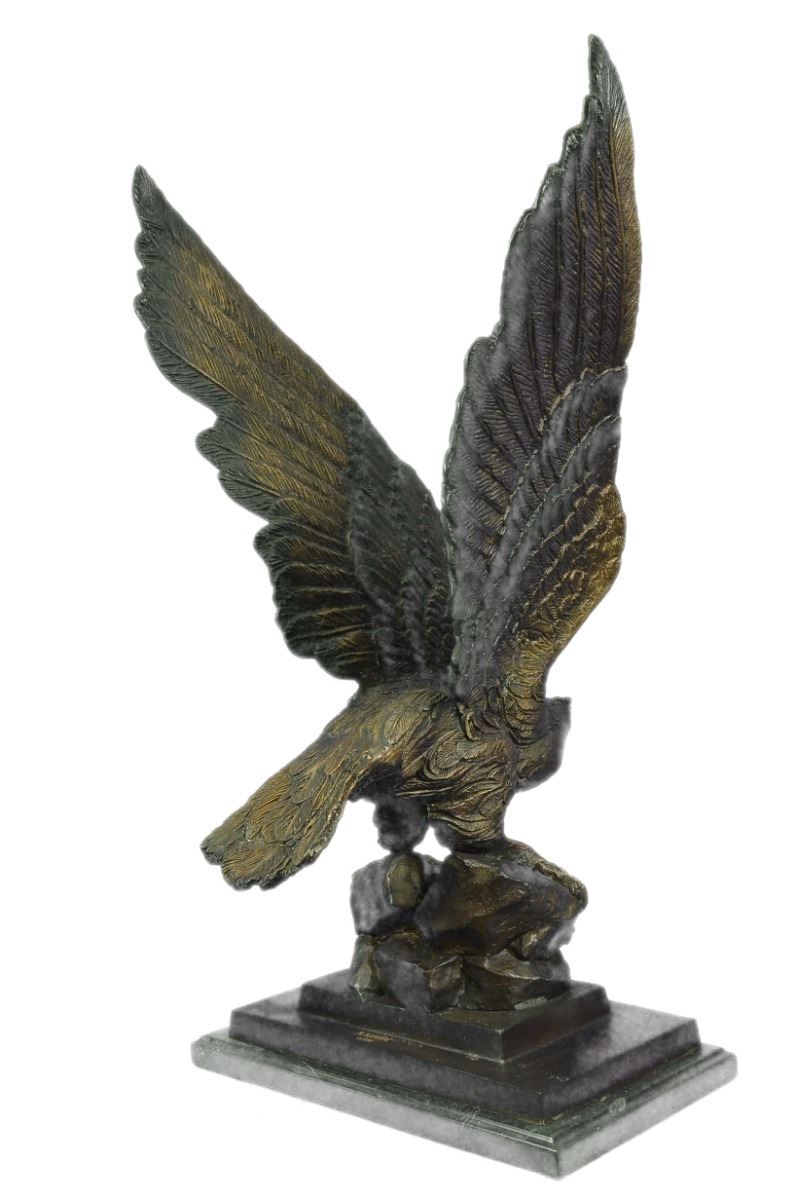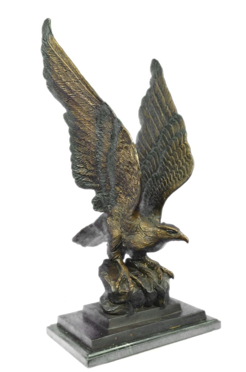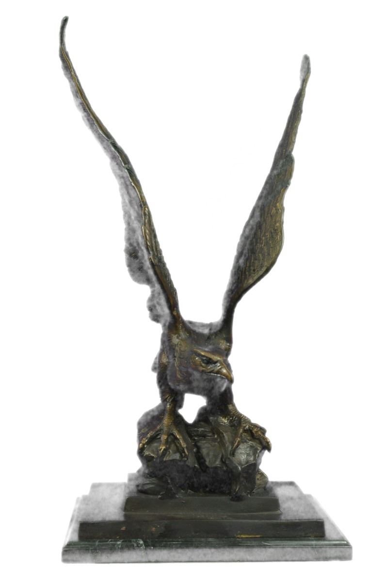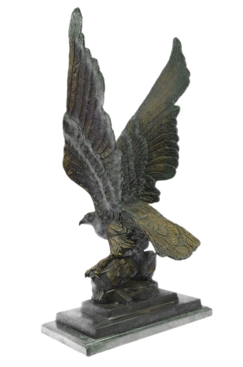He grips tightly to the rock with his talons and he spreads his wings high and wide as if he is about to take off. His head is cocked off to the left as if he has just spotted his new prey. This American Bald Eagle is an absolutely gorgeous species with a strikingly beautiful look. His fully spread wing span is an amazing breathtaking sight giving this sculpture an energetic vibe. The detail of his face, beak and talons are quite intricate and has great life like qualities. This gorgeous bird's beauty demands respect and he personifies in himself freedom. This sculpture was cast usign the Lost Wax Method ensuring the detail of quality. This sculpture has a special hand painted patina and is a Limited Edition. This sculpture is mounted on a gorgeous black marble base. Bronze Dimensions with Marble Base: Height 30 X Width 16 inches. Weight: 50 LBS. Inventory: 2456308M24042