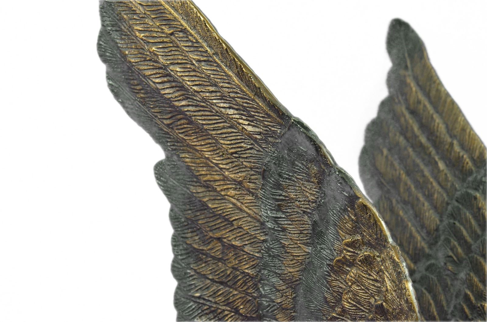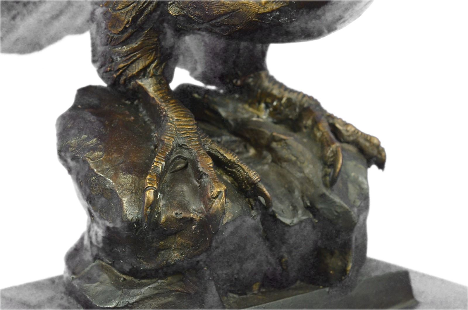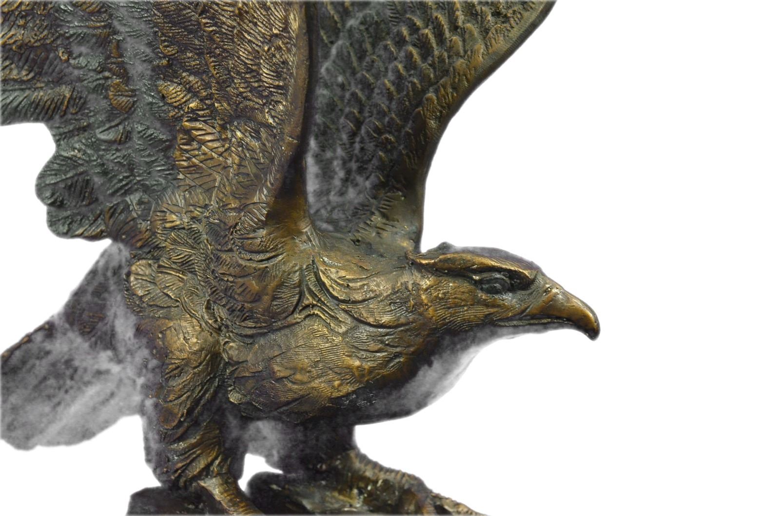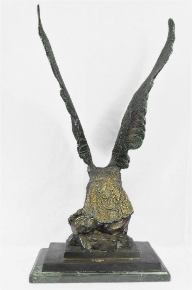 He grips tightly to the rock with his talons and he spreads his wings high and wide as if he is about to take off. His head is cocked off to the left as if he has just spotted his new prey. This American Bald Eagle is an absolutely gorgeous species with a strikingly beautiful look. His fully spread wing span is an amazing breathtaking sight giving this sculpture an energetic vibe. The detail of his face, beak and talons are quite intricate and has great life like qualities. This gorgeous bird's beauty demands respect and he personifies in himself freedom. This sculpture was cast usign the Lost Wax Method ensuring the detail of quality. This sculpture has a special hand painted patina and is a Limited Edition. This sculpture is mounted on a gorgeous black marble base. Bronze Dimensions with Marble Base: Height 30 X Width 16 inches. Weight: 50 LBS. Inventory: 2456308M24042
