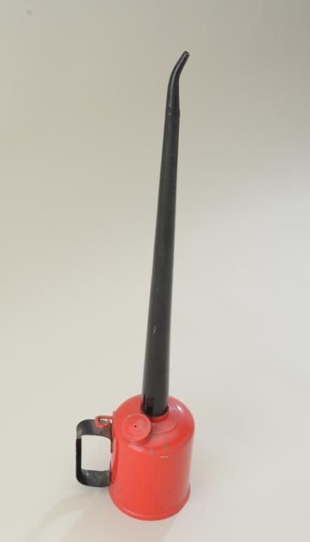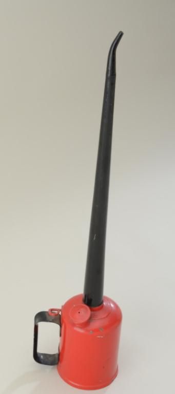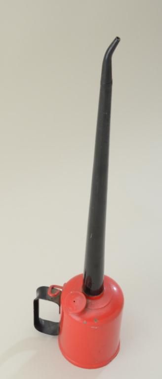 Eagle brand metal railroad oil can of the style kept in the railroad clapper box; overall good condition with long metal spout painted black with black handle and body of can painted red. Est.: $150-$300.
