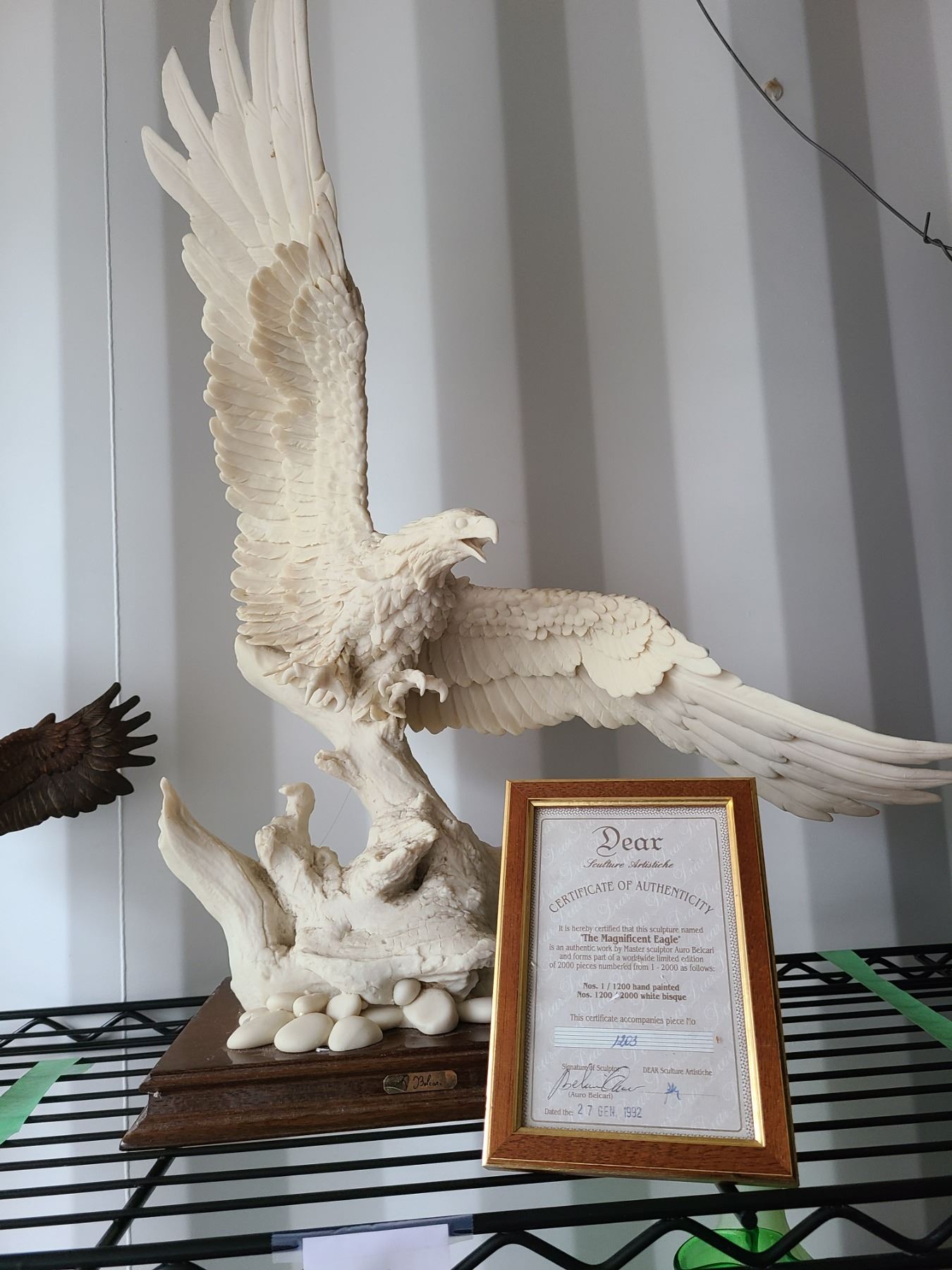 Large white bisque eagle on stand with Certificate of Authenticity. Very heavy and delicate. Bring packing material. Pickup at 9 am.