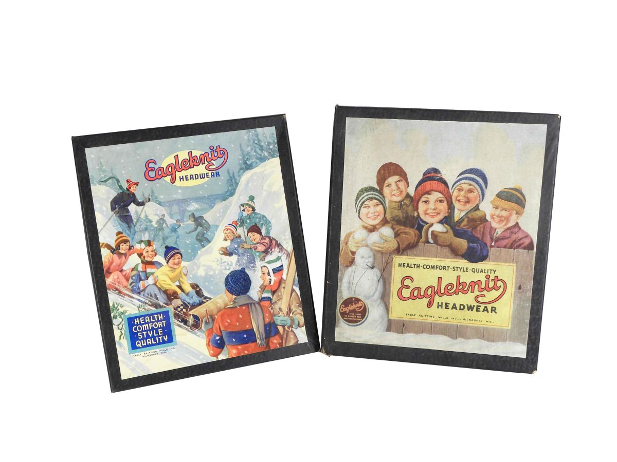 Eagleknit Headwear Store Display Boxes w/easel back lids. Eagle Knitting Mills Inc. Milwaukee, WI. Both in excellent condition. Each box measures 11 1/4 X 13 1/4 X 3 inches.