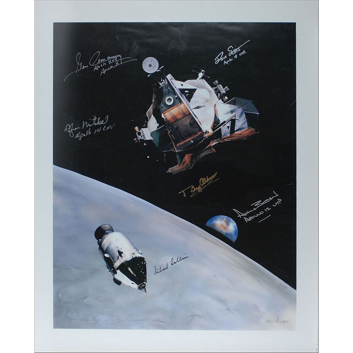 Color limited edition 26 x 32 print entitled ‘The Eagle’s Last Flight,’ numbered 105/1969, signed in felt tip and ink by Buzz Aldrin, Michael Collins, Alan Bean, Edgar Mitchell, Dave Scott, and Gene Cernan. Also signed in pencil by the artist, Dan Witkoff. Rolled and in fine condition, with dings to one corner.