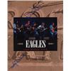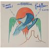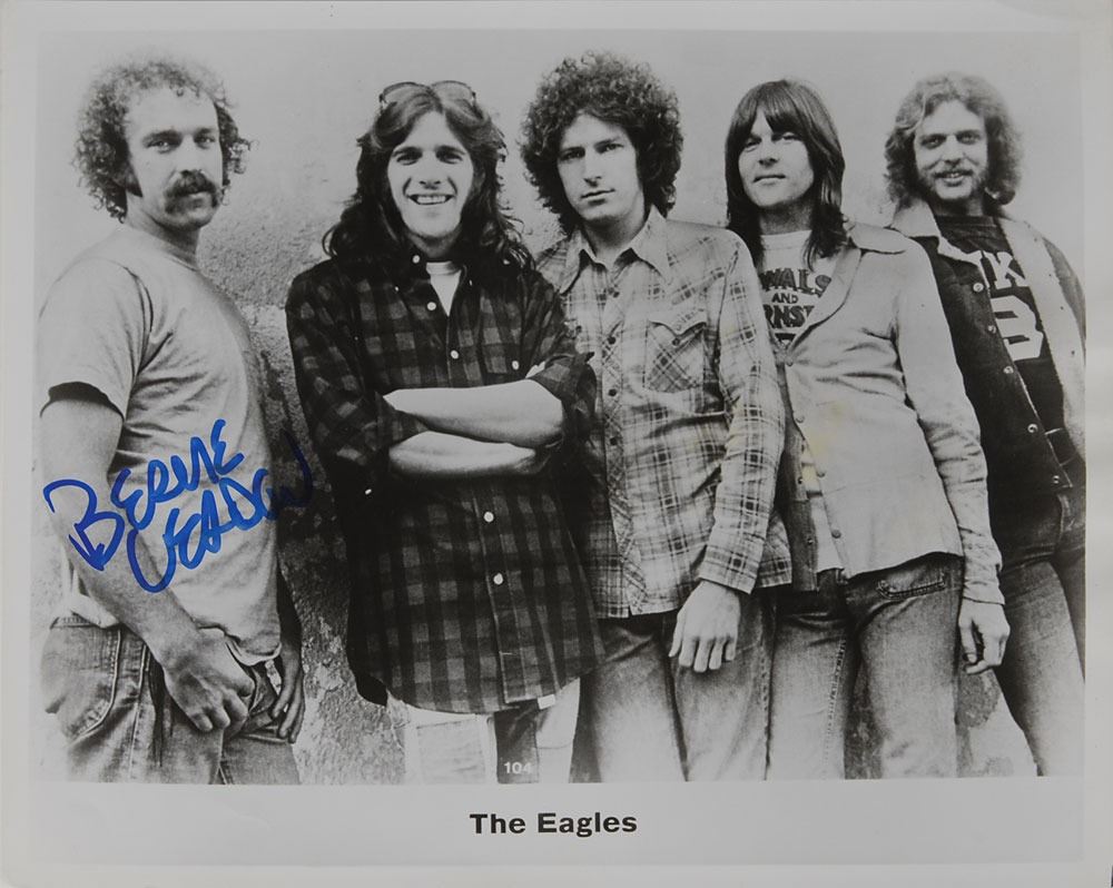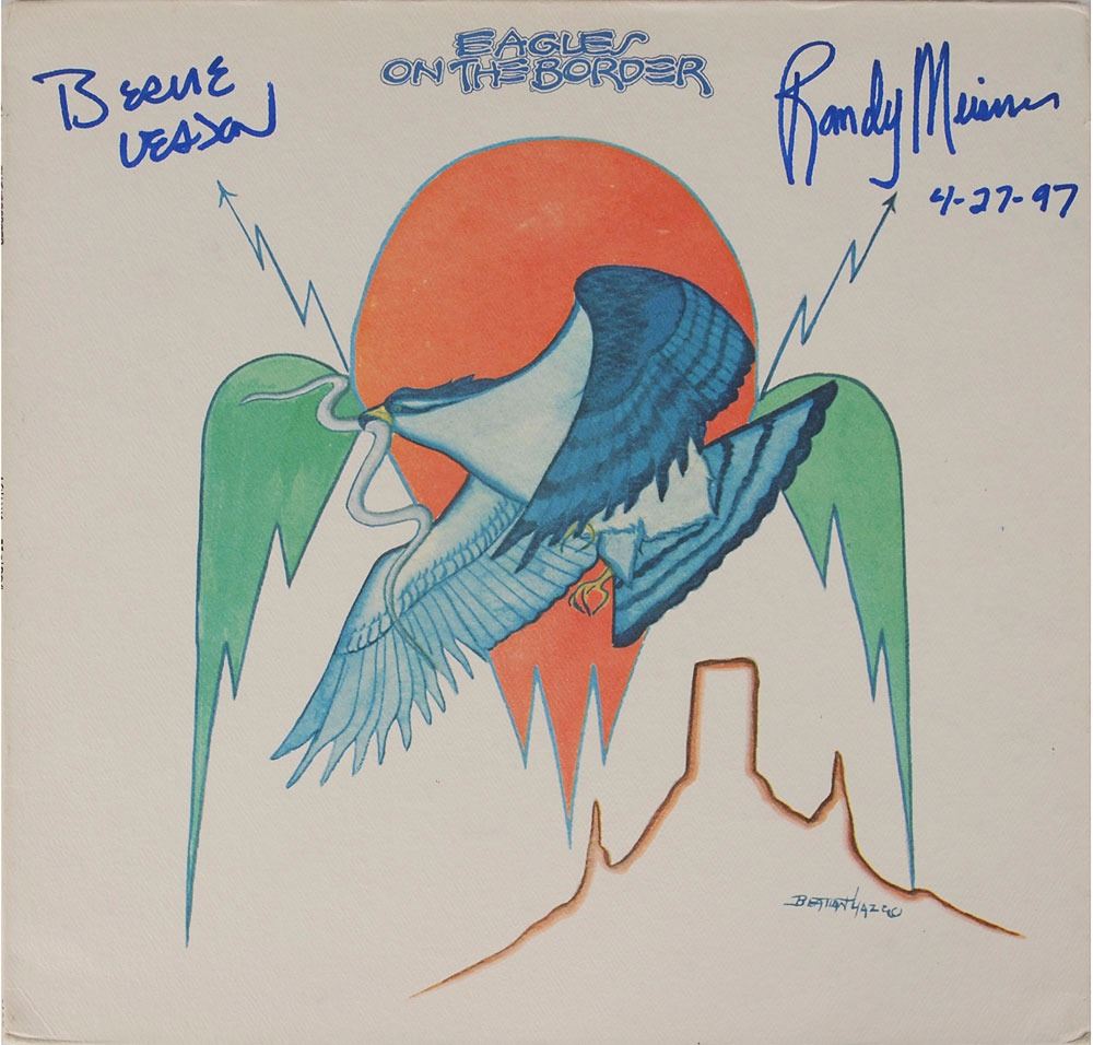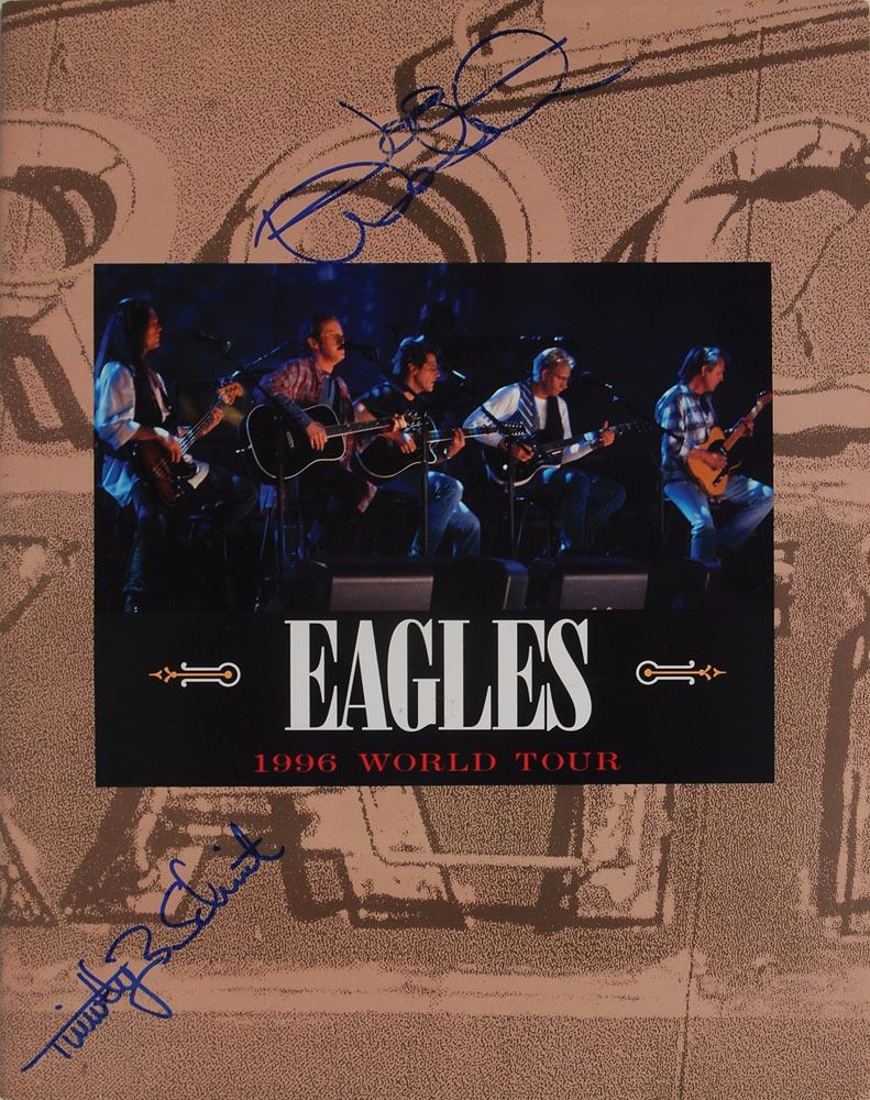Three items: a glossy 10 x 8 photo of the Eagles, signed in blue felt tip by Bernie Leadon; an On the Border album, signed on the front cover in blue felt tip by Bernie Leadon and Randy Meisner; and a program for the Eagles' 1996 world tour, signed on the front cover in blue felt tip by Joe Walsh and Timothy B. Schmit. In overall fine condition, with wrinkling and light yellow stain to center of photo. The record is not included. Pre-certified REAL.