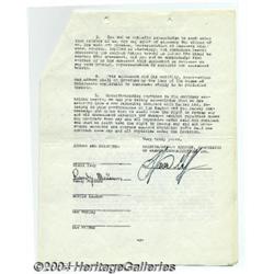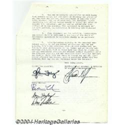 <B>Eagles - Signed Agreement (1974).</B></I> A set of two documents, each of two pages, 8.5" x 11", dated 8/21/74, detailing a termination of contract between the Eagles and Elektra/Asylum Records. The first document is signed by band members Glenn Frey, Bernie Leadon, Don Henley and Don Felder. The second document is signed by Randy Meisner. Both documents are in Fine condition. <I>Accompanied by COA from PSA/DNA. </B></I> <BR><BR><B>Important notice:</B> Heritage usually auctions material at the rate of 200-250 lots per hour. On some occasions eBay Live bid software or the Internet may not be able to keep up with the pace of the auction. We recommend placing a realistic absentee bid now as insurance to avoid disappointment. Occasionally the auctioneer may eliminate or reject an eBay Live bid, and the auctioneer may also reopen a lot after the close of the eBay live bidding (usually because we missed an audience bid), and may reject your bid even if it shows you as the winning bidder. By bidding via eBay Live, you agree that Heritage may award the lot to another bidder at its sole discretion under the circumstances described above or any other reasonable circumstances. Since eBay bids are not shown to us until we open the lot on the floor, we treat those bids just like floor bids. In most cases the floor responds before the eBay bid is presented to us, due to Internet lag time, so for consistency we have made it a policy that floor bids are always considered first over tie eBay live bids. Also please note that all Heritage lots purchased through eBay Live carry a 24.5% Buyer's Premium. Please make sure you read the Terms and Conditions before you bid.