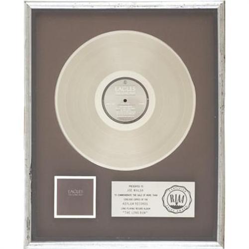 <B>Eagles</B></I> <B><I>The Long Run</B></I></B></I> <B>RIAA Platinum Album Award (1979).</B></I> Presented to Joe Walsh to commemorate the sale of more than one million copies of the band's 1979 studio LP, the last before a highly public break-up that lasted 14 years. The album went platinum in 1980, and has done so six more times since then. Framed to an overall size of 17" x 21" and in Very Fine condition with some mild wear to the frame. <I>From the Joe Walsh Collection.</B></I><BR><BR><b>Shipping:</b> Framed - with Glass, Medium (<a target="_blank" href="http://www.heritageauctions.com/common/shipping.php">view shipping information</a>)