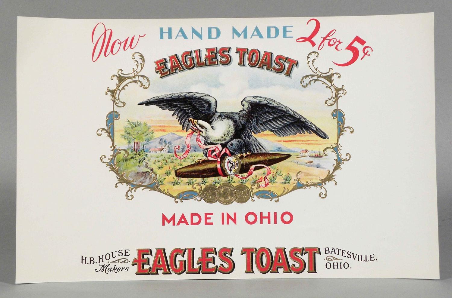 Eagles Toast Cigar Box Label. Batesville, Ohio. Embossed with gold leaf. Mint condition. 10 3/4 X 6 7/8 inches. Starting bid $100