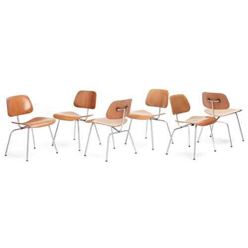 Charles and Ray Eames DCMs, set of six, by Herman Miller,1950s, molded ash plywood seats and backs over chromed steel legs with original screw-on glides, original finish, all glides intact, some normal wear,19.5in.w x 22in.d x 29in.h,very good condition
