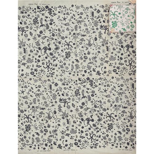 Ray Eames Sea Things fabric sample, by Schiffer, c.1951, original production sample with two smaller samples in green/white and red/ white colorways, printed on selvedge: Sea Things by Ray Eames, Vat Dye Hand Print and Schiffer Prints, original paper tag