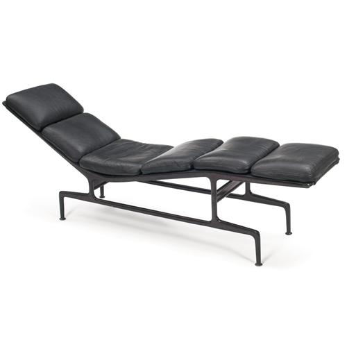Charles and Ray Eames chaise, by Herman Miller, eggplant-colored cast aluminum frame and nylon-coated fabric sling seat supports six connected black leather cushions,17.5in.w x 76in.d x 29in.h,very good condition