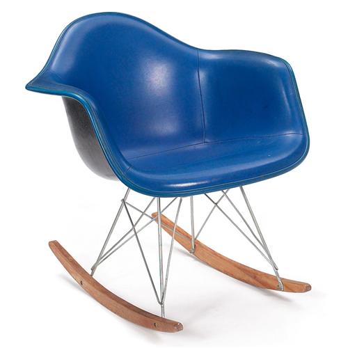 Charles and Ray Eames rocker, by Herman Miller, gray fiberglass shell with original blue vinyl upholstery over a zinc-plated wire base with birch runners, impressed mark, original finish to all, 25"w x 28"d x 27"h, very good condition