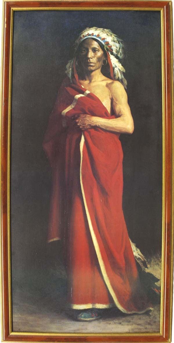 Framed Eanger Irving Couse Framed Print ''Taos Chief'', visual measures 35''L x 15.75''W, framed measurement of 37.5'' x 19'', possibly of Elk Foot of the Taos Tribe, FYI: ''Eanger Irving Couse (1866-1936) was an American artist and a founding member and first president of the Taos Society of Artists. Elk-foot, whose anglicized name was Jerry Mirabal, began posing for Couse in 1907 and was one of the painter's favorite subjects because of his physical beauty and ideal features.''