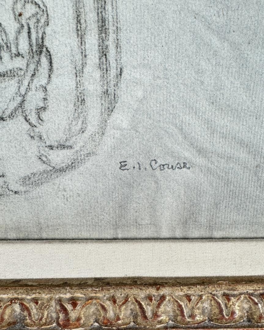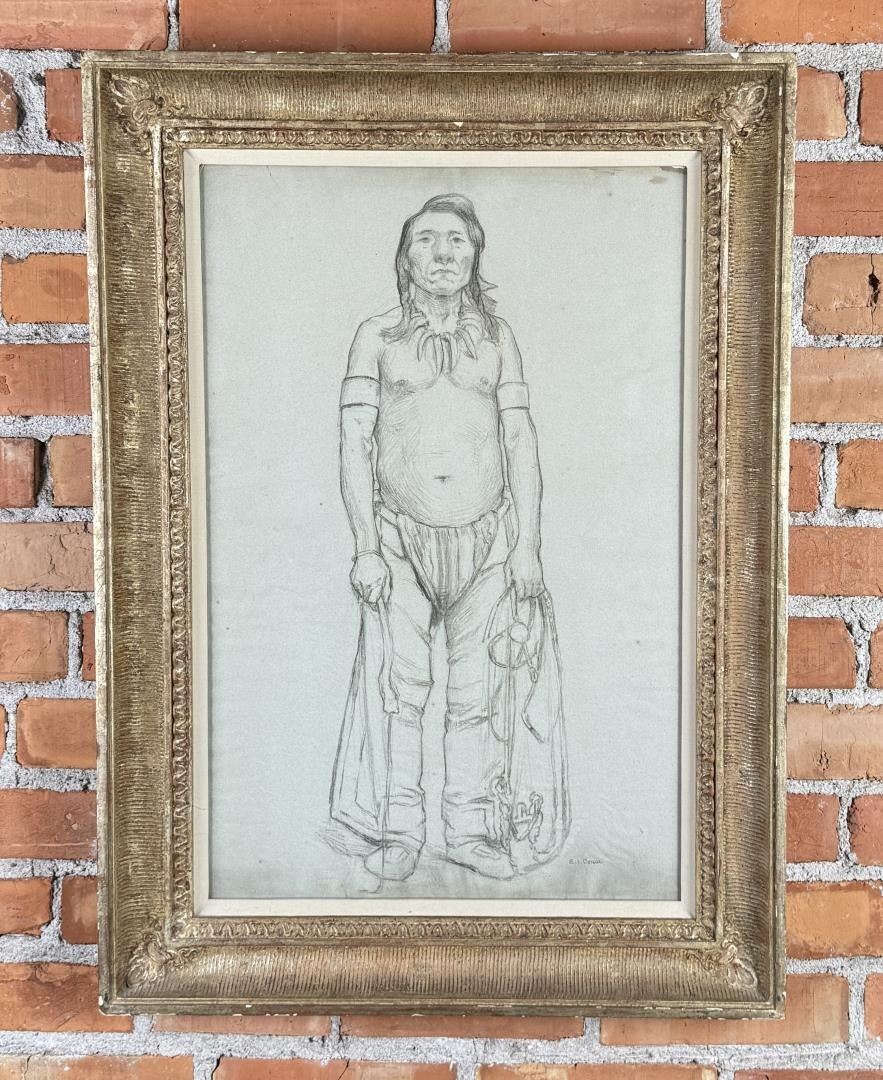 Title is Cayuse Indian Brave. 16" by 24" unframed. 21 1/2" by 30" framed. Provenance: C.R. Morrison Gallery of Western Art, Livingston, Montana, October 6, 1985 Acquired from the above by Mr. Win Case, Saginaw, Michigan Exhibitions: The Saginaw Art Museum, Saginaw, Michigan, circa 1986 Eanger Irving Couse (1866 - 1936) was active/lived in New Mexico, New York, Michigan / France. Eanger Couse is known for Indian figure and genre painting, illustration. Born in Saginaw, Michigan, Eanger Couse is primarily known for paintings of Taos Pueblo Indian males sitting or squatting by camp fire light, suggesting that Indians were peaceful, dignified human beings and not the savages of Western lore. Growing up in Saginaw, he lived among the Chippewa Indians and as a youngster did sketches of these native people. From a poor family, he was a determined artist who studied for three months at the Art Institute of Chicago, having earned just enough money by painting houses, and then he returned to Saginaw to earn more money so he could go to New York City which he did in 1885. He enrolled in the National Academy of Design and did many odd jobs to support himself, and after two years returned to Saginaw, again to earn money. In 1887, he went to Paris to the Academie Julian where his great influence became the superb draftsmanship and classical techniques of William Adolphe Bouguereau. Couse returned to Paris many times, and on one of these trips met his future wife, Virginia Walker, an art student whose family had a ranch in Oregon. When he and his wife visited her parents on a sheep ranch in Oregon, he painted the Yakima, Umatilla, and Klikitat Indians in the pastel colors of the French Barbizon School. However, there was little interest in Indian subject matter for fine art in America. He also painted pastoral scenes, which were more popular than his Indian subjects. Couse went back to France and settled in a rural town in the province of Pas de Calais on the English Channel and painted bucolic genre scenes, invariably with sheep on hillsides. Although he had stylistic influences from Europe, he became more and more determined to create an art that was uniquely American and was increasingly fascinated with Indians as subject matter. In 1902, Couse visited Taos, New Mexico for the first time, having heard about it in Paris from his friend, Joseph Henry Sharp. In Pueblo Indians, Couse found the subject matter that seemed right for him, but he had difficulty finding ones to pose because of their belief that the soul of the sitter passes into the picture once it is completed. In 1912, when the Taos Society of Artists was formed, he was elected its first president, and in 1927, he and his family moved there permanently. His wife died two years later, much affecting his spirit and the vitality of his paintings. Although he posed models for sketching outdoors, he continued to paint in his comfortable studio in a French academic manner. He also painted occasionally in Arizona, going first in 1903, to the Hopi ceremonies at Walpi. His models for most of his New Mexico Indian figure painting were Ben Lujan and Geronimo Gomez, Taos Pueblo residents. The tone is poetic and peaceful and reflects a civilization that is at peace with itself. Usually the squatting Indian figures were engaged in domestic activity such as preparing food, and their handsome physiques were accentuated by moonlight. Beginning 1914, his paintings were used on calendars by the Santa Fe Railway and became the basis for the company's comprehensive Southwest art collection. The first calendar painting was "Wal-si-el, Good Medicine", which initiated the tradition of using Taos painters on the calendars, and twenty-three of them had work by Couse.