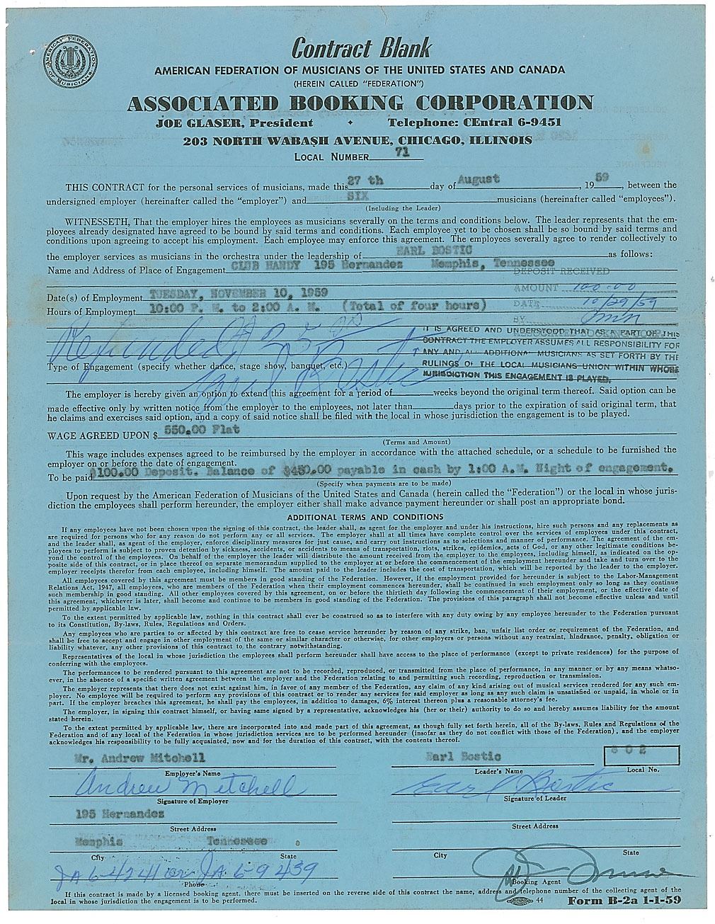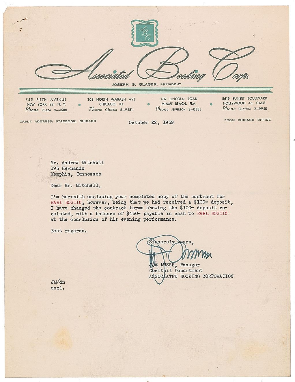 Jazz alto saxophonist and a pioneer of the post-war American rhythm and blues style (1913–1965) whose hits included 'Flamingo,' 'Harlem Nocturne, 'and 'Where or When,' among others. He had a major influence on John Coltrane. DS, one page, 8.5 x 11, August 27, 1959. Contract by which Bostic agrees to play at Club Handy in Memphis on November 10, 1959. Signed at the conclusion in blue ballpoint by Earl Bostic and countersigned by Andrew 'Sunbeam' Mitchell, the club's owner. In fine condition. Accompanied by a letter from Bostic's manager, Joe Musse, concerning the payment for the performance.