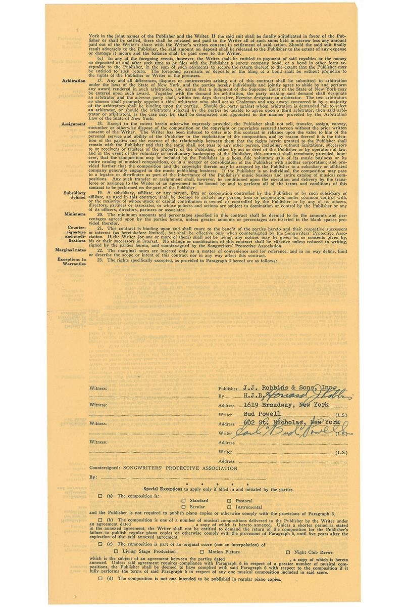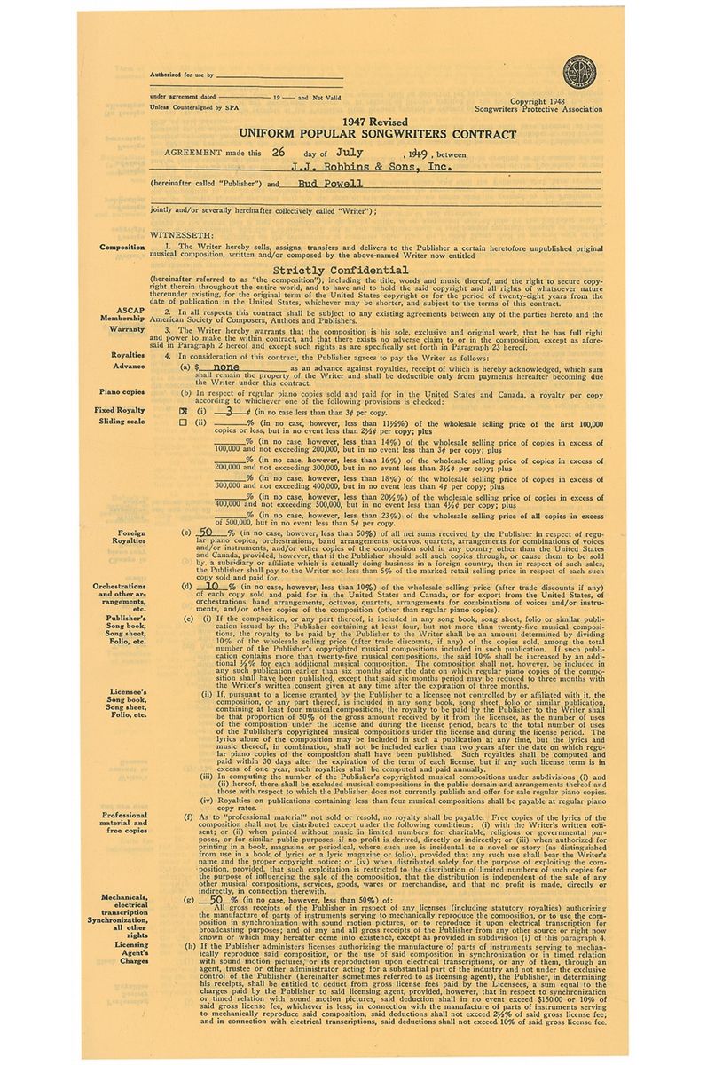 Jazz pianist (1924-1966). DS, four pages on two adjoining sheets, 8.25 x 16.5, July 26, 1949. Uniform popular songwriters contract between J. J. Robbins and Powell in which Powell sells “a certain unpublished original musical composition…entitled Strictly Confidential,” in exchange for no money, but with a fixed royalty of three cents per copy, 50% of foreign royalties, 10% of orchestrations, and 50% of electrical transcriptions. Signed on the last page by Powell. In fine condition. ‘Strictly Confidential’ was one of a series of informal performances recorded in Francis Paudras' apartment in Paris.