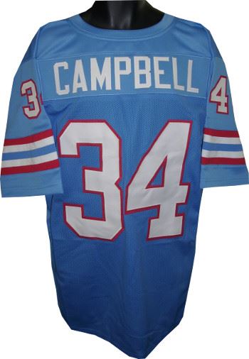 Earl Campbell was the first draft pick overall in the 1978 NFL Draft by the Houston Oilers, and in that year he was named the Offensive Rookie of the Year by the Associated Press as well as the Most Valuable Player. The Luv Ya Blue era in Houston was due mostly to Campbell's running ability and Coach Bum Phillips' "good ole boy" personality. Campbell possessed a rare combination of speed and power, and was a prolific running back from 1978 through 1985. His outstanding single-season performance in 1979 earned him All-Pro, Pro Bowl, and NFL Offensive Player of the Year honors.This is an Earl Campbell Houston Oilers unsigned Blue TB unlicensed custom-prostyle jersey with twill stitched nameplate and numbers. perfect for autograph or to wear! Size XL