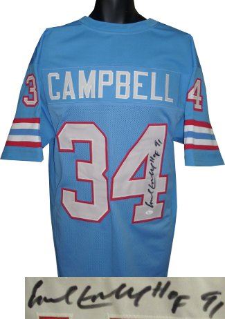 Earl Campbell was the first draft pick overall in the 1978 NFL Draft by the Houston Oilers, and in that year he was named the Offensive Rookie of the Year by the Associated Press as well as the Most Valuable Player. The Luv Ya Blue era in Houston was due mostly to Campbell's running ability and Coach Bum Phillips' "good ole boy" personality. Campbell possessed a rare combination of speed and power, and was a prolific running back from 1978 through 1985. His outstanding single-season performance in 1979 earned him All-Pro, Pro Bowl, and NFL Offensive Player of the Year honors. Earl Campbell has hand autographed this Houston Oilers Blue Prostyle Jersey with HOF91 inscription. James Spence Hologram and Certificate of Authenticity.